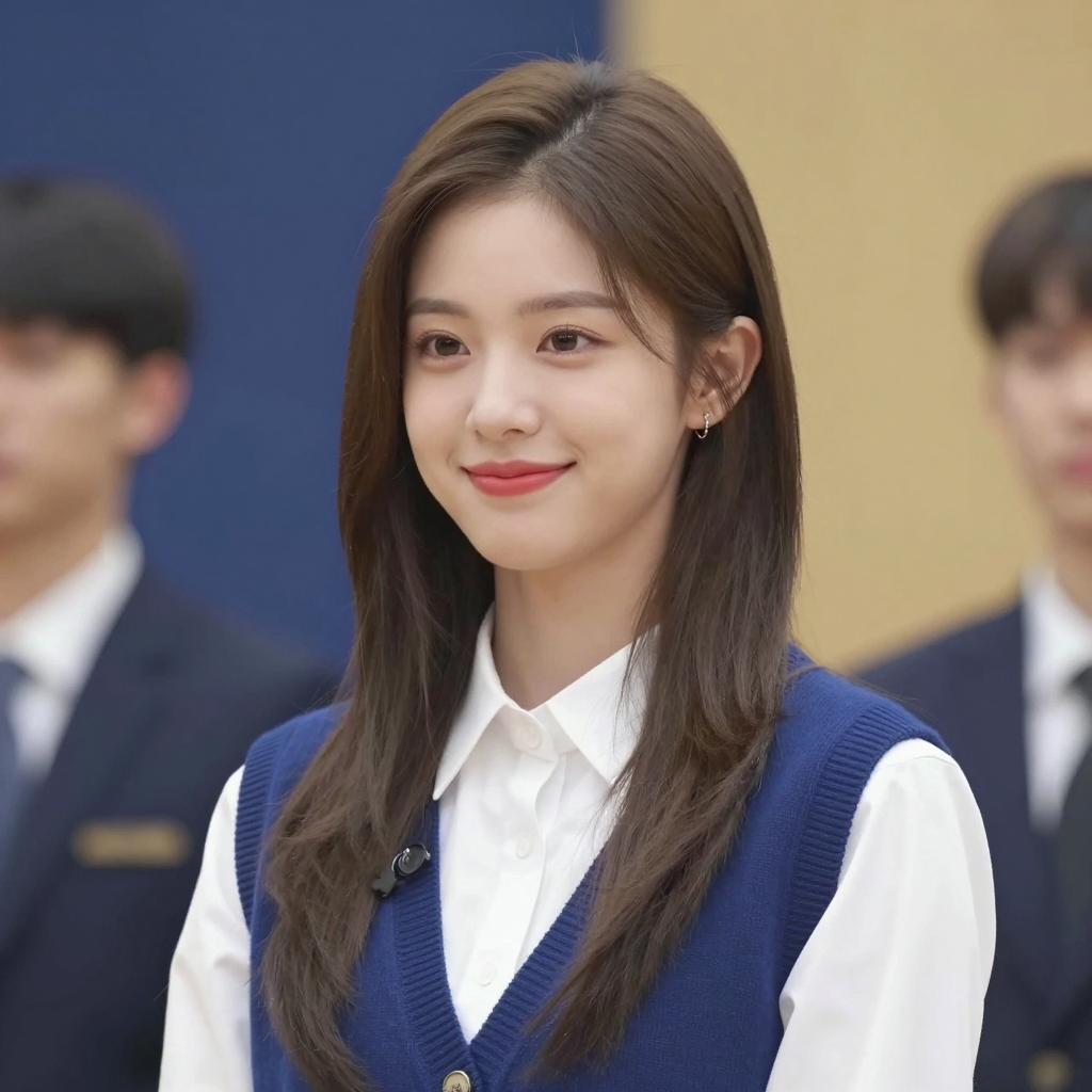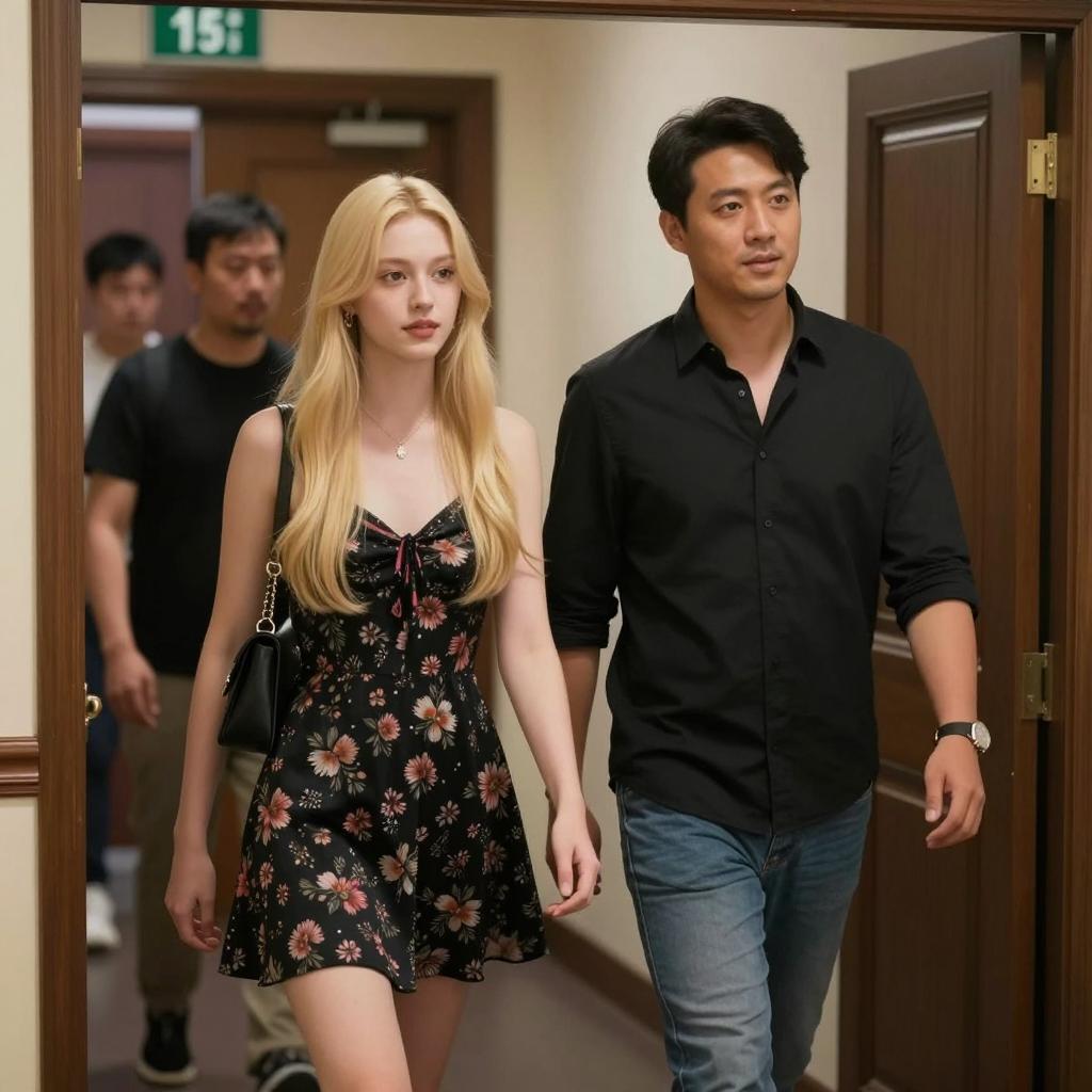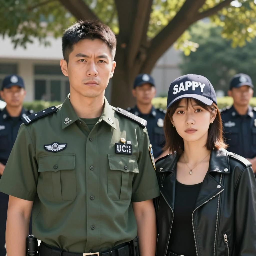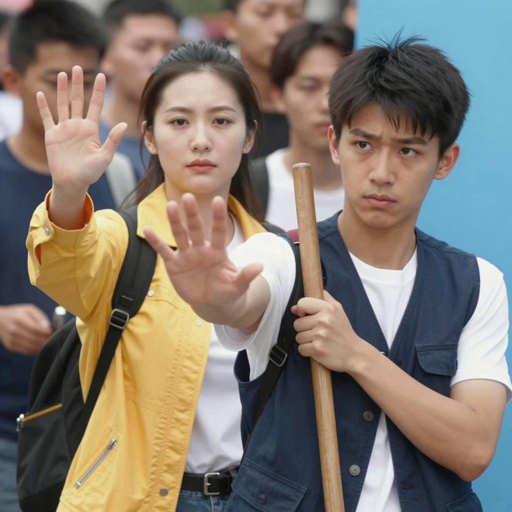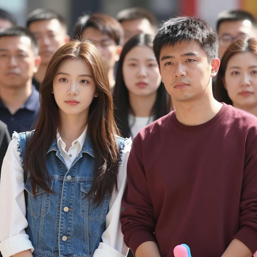 Photograph of a crowd. Two central people, a young woman with long brown hair, blue denim vest, white shirt, and a young man with short dark hair, maroon shirt, holding a pink and blue object. Background people blurred. Sunlight. Facial expressions neutral. Young woman slightly to the left, young man to the right. Crowded outdoor setting.