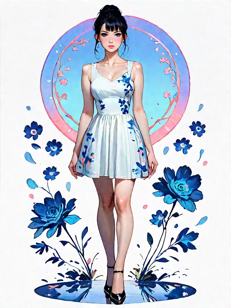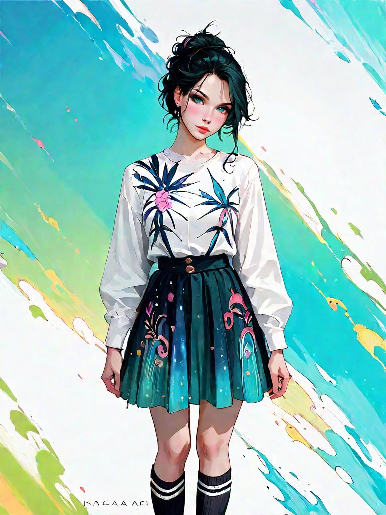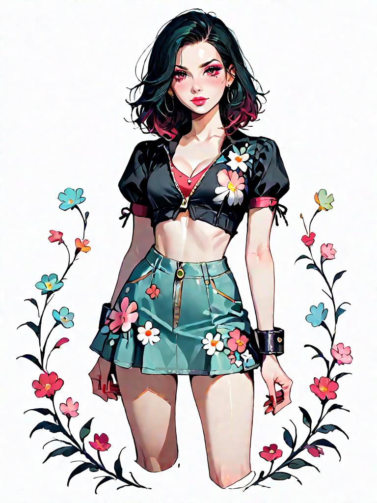 1girl, source_comics, realistic face, full body shot, Woman, casual, white long-sleeve top with lace shoulder accents, fitted maroon skirt with button detail and lace hem, pendant necklace.