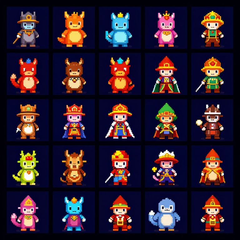 Sprite grid showcasing a collection of vibrant pixel art characters, each cell displaying unique fantasy creatures and heroes, arranged in a colorful 8-bit style matrix, set against a dark retro game background, evoking classic video game aesthetics.