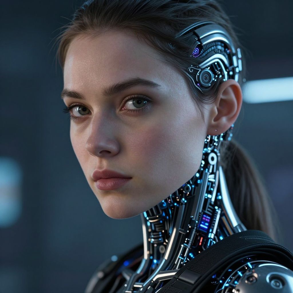 Photorealistic CGI of a young woman with cybernetic enhancements, featuring glowing circuits on her neck and hair, with a serious expression in a dim