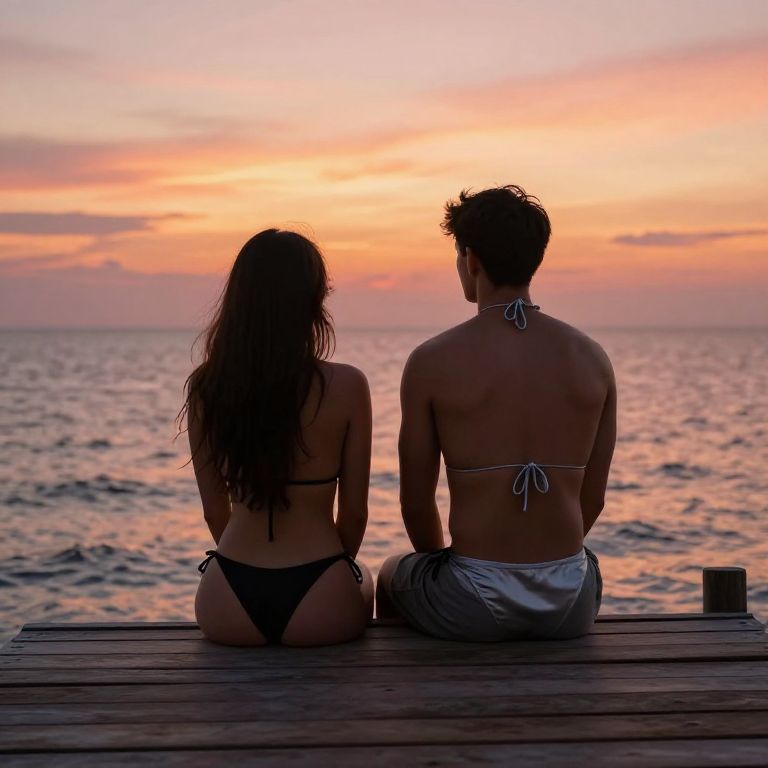 Bikini couple prompt: A cozy seaside sunset scene with a couple in minimalistic black and silver bikinis, sitting on a wooden dock with a view of the ocean, warm orange and pink sky, soft shadows, intimate mood, cinematic lighting, detailed realism.