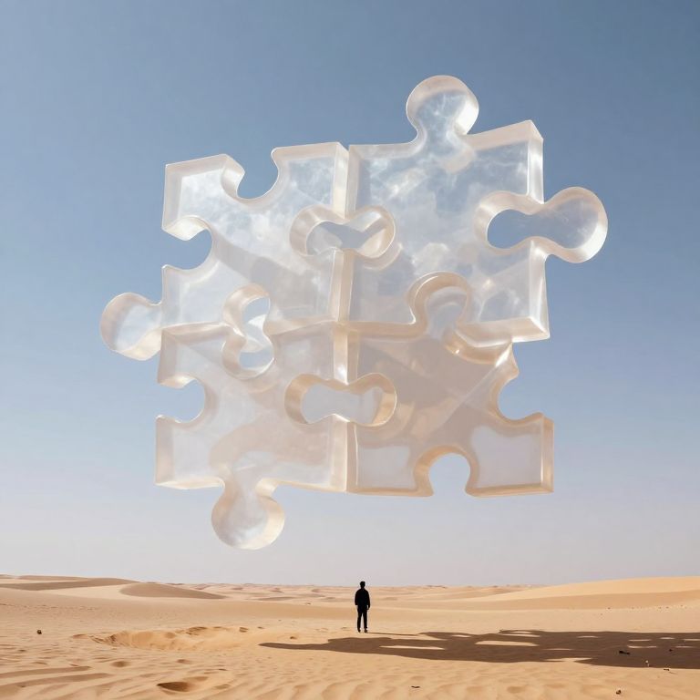 Photograph-like CGI image of a vast, sunlit desert with a single silhouetted figure standing in the center. Above the figure, a large, glowing, translucent jigsaw puzzle piece hovers in the clear, blue sky. The puzzle piece is illuminated from within, casting soft, white light and subtle shadows on the sandy ground. The desert's smooth, golden sand extends to the horizon, with no other objects or landmarks visible. The scene evokes a sense of isolation and wonder, with the floating puzzle piece suggesting themes of connection or solution. The colors are predominantly blue, gold, and white.