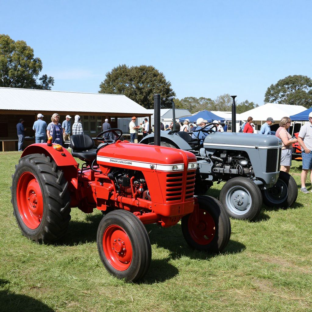 Vintage tractors, including a striking red model and a gray one, are showcased at the Quirindi Rural Heritage Village's Machinery and Miniature Railway Rally and Swap Meet, with enthusiasts and spectators gathered around on a sunny day.