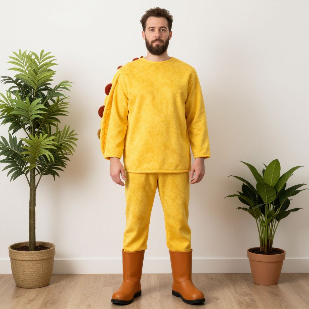 Adult realistic taco costume, 1boy, male focus, beard, solo, facial hair, plant, boots, standing, full body, potted plant, looking at viewer, pants