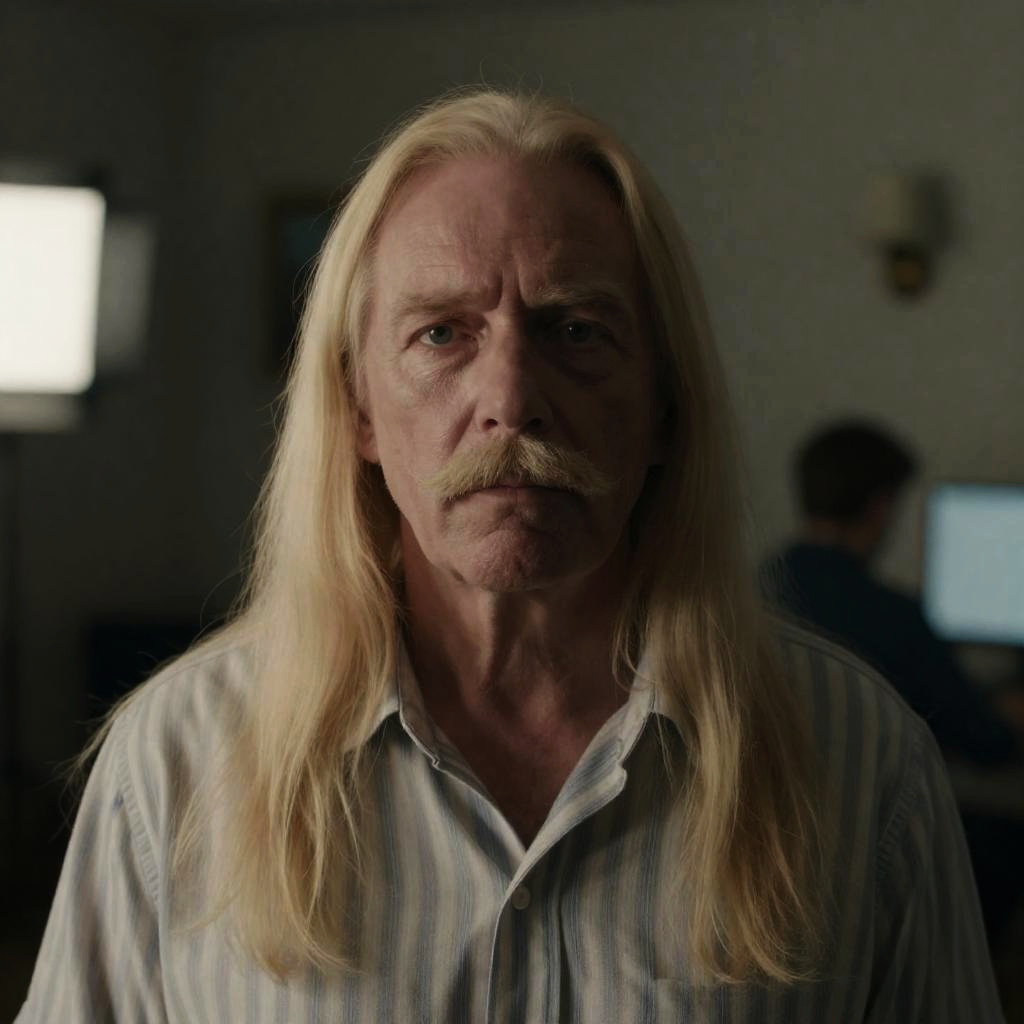 Middle-aged man with long, blonde, slightly messy hair and a gray beard, intense expression, wearing a brown sweater, illuminated by two bright, circular, orange lights in a dimly lit room. Mask with a white face and red nose on the left. Background includes red and yellow tones.