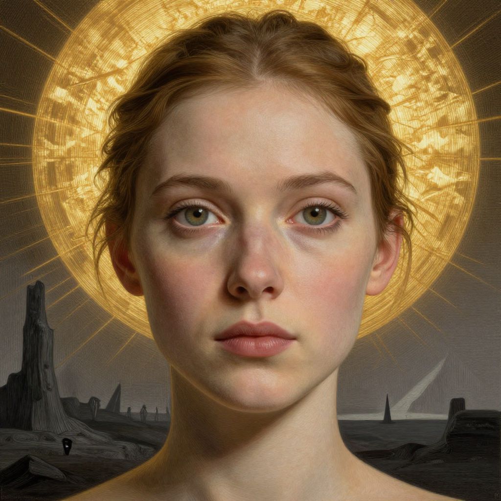 Psychedelic drawing of a very symmetrical portrait a face with a angel halo!!!, the face has compound eyes human eyes!!, style of oil painting by chris dyer, double vision