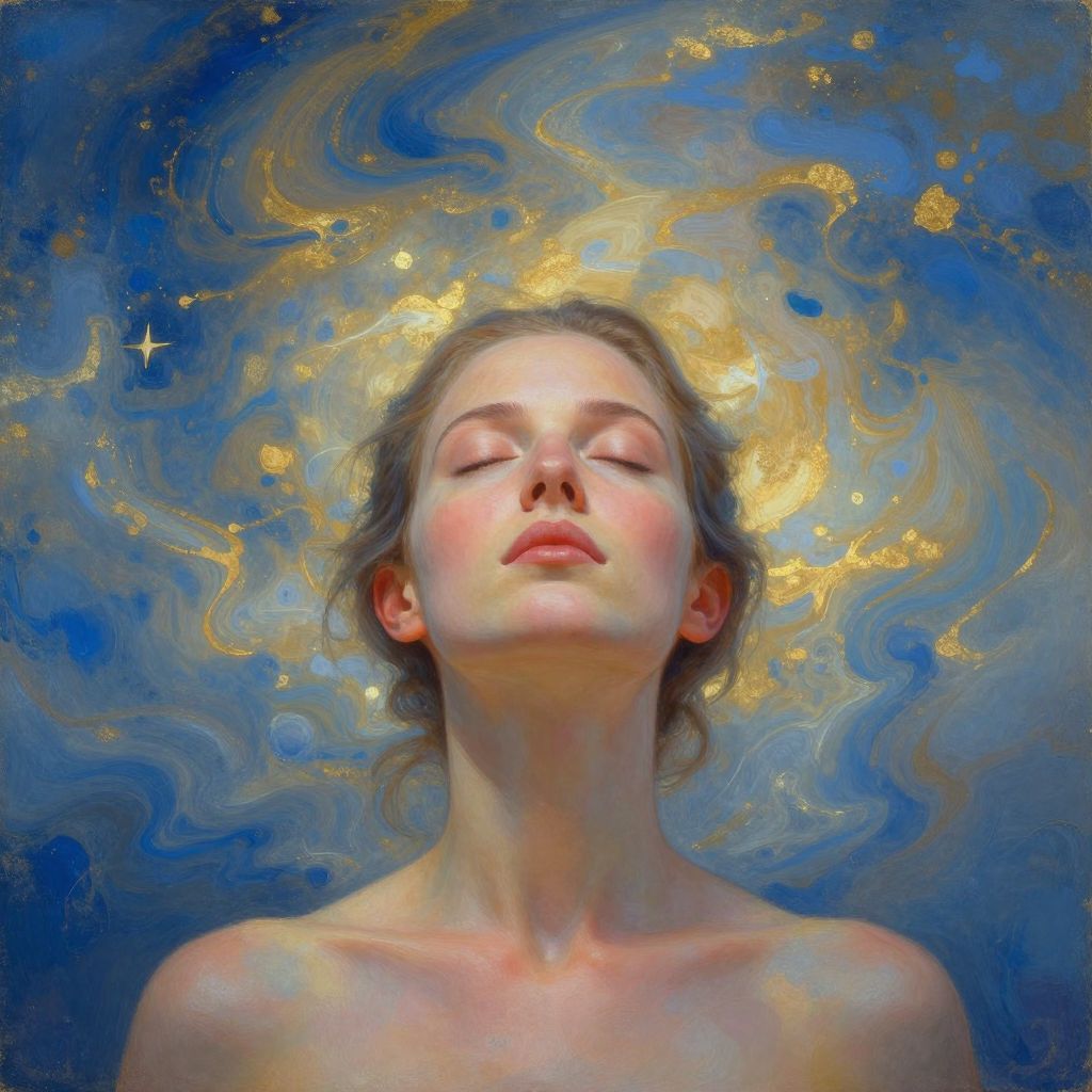 Digital painting of a fair-skinned, blue-eyed angelic woman with a glowing yellow halo above her head. She has light brown, wavy hair and white feathered wings emerge from her back. Her face is centered, showing a serene expression with light pink lips and subtle blush. Two additional identical profiles of her face flank her, one on each side, blending into her central face. The background is a gradient of blue, enhancing the ethereal quality. The style is realistic with a soft, painterly texture.