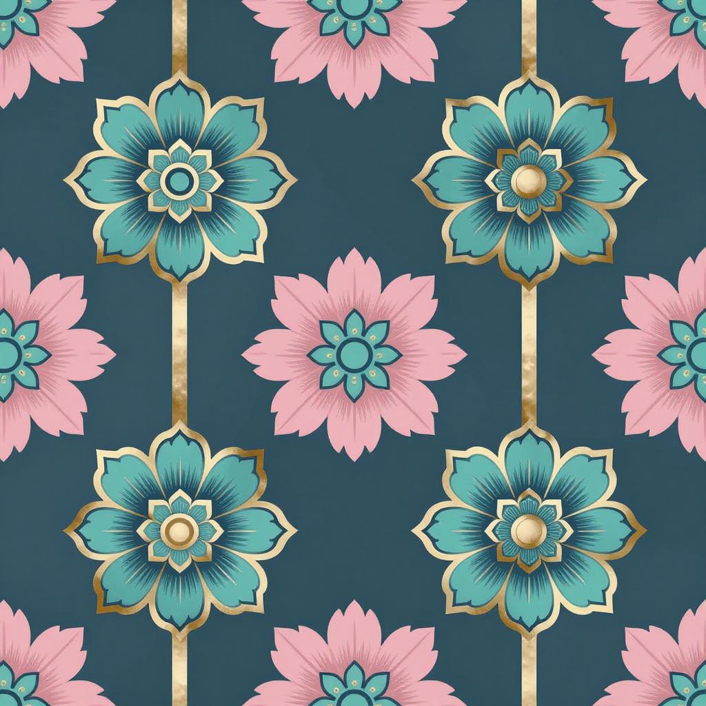 Seamless decorative floral pattern featuring large teal and pink stylized flowers with intricate petal and leaf designs on a dark teal background. The symmetrical arrangement showcases alternating large flower motifs and vertical elements with soft metallic accents.