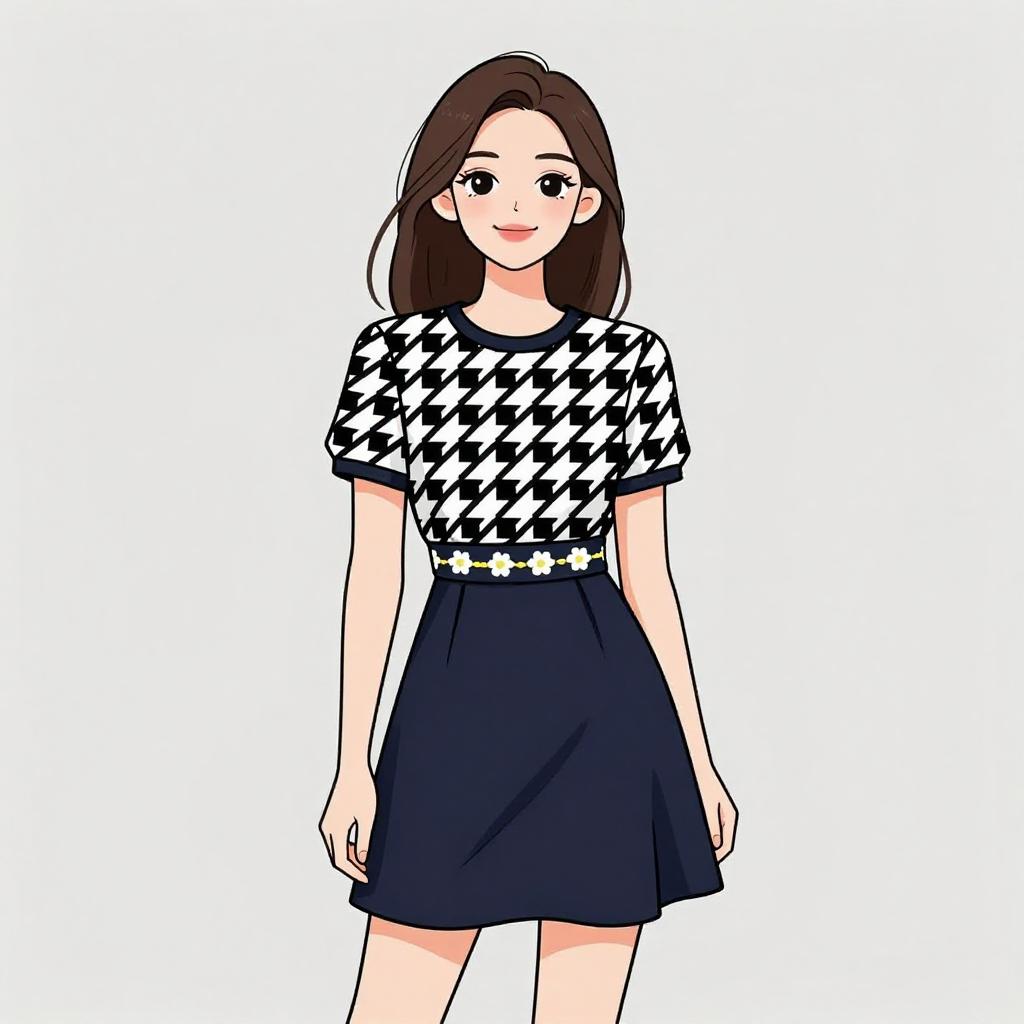 Woman with pretty face and pretty hair. smiling Woman, casual, black and white printed short-sleeved top, round neckline, tucked into a solid mustard yellow A-line mini skirt, front button fastening, no visible accessories. --sref 1467