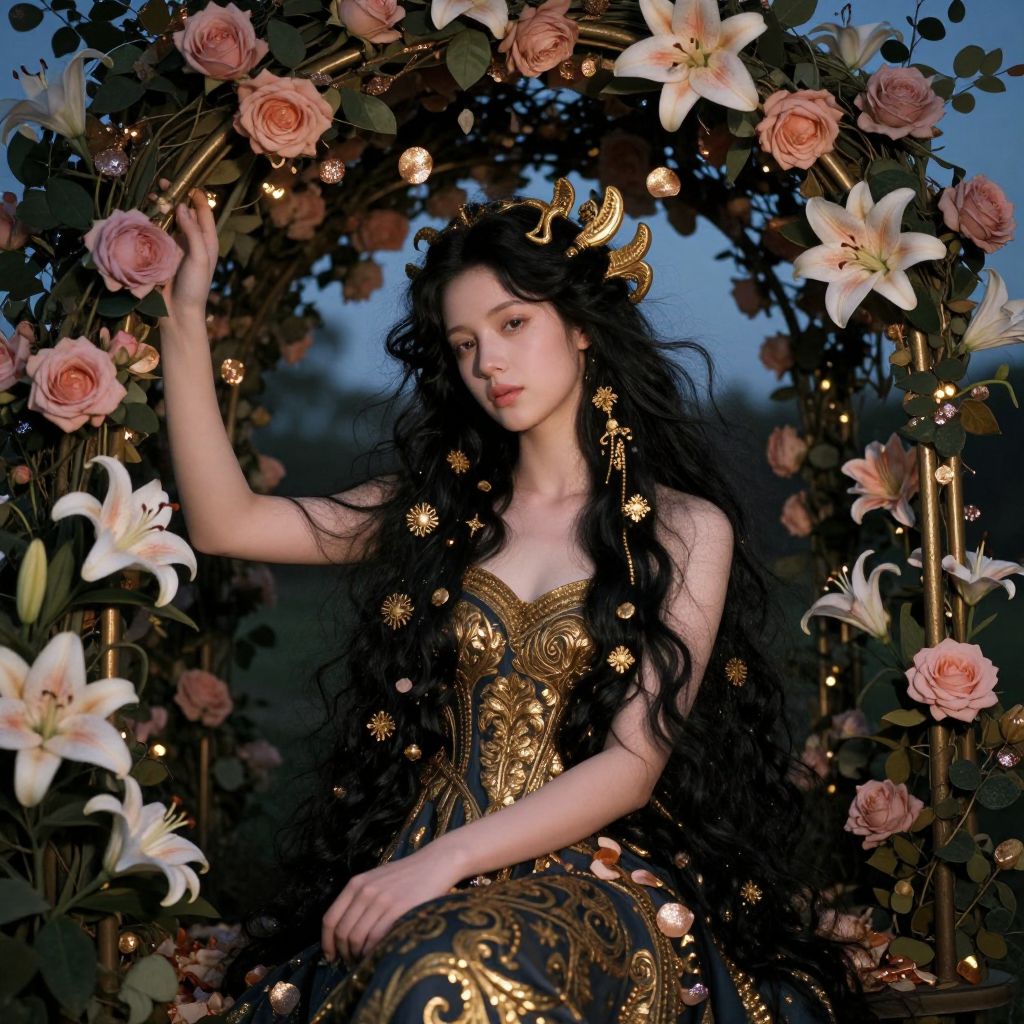 Photorealistic digital artwork of a fair-skinned, dark-haired woman with long, wavy locks and a crown of small gold horns. She wears an elaborate, gold-embroidered black dress with intricate patterns, and sits within a floral archway adorned with white and pink roses, and lit by small golden lights. Her right arm is raised, touching the arch, while her left hand rests on her lap. The background is a twilight sky, creating a mystical, ethereal atmosphere. The woman's expression is serene and slightly melancholic, enhancing the magical and otherworldly feel of the image.