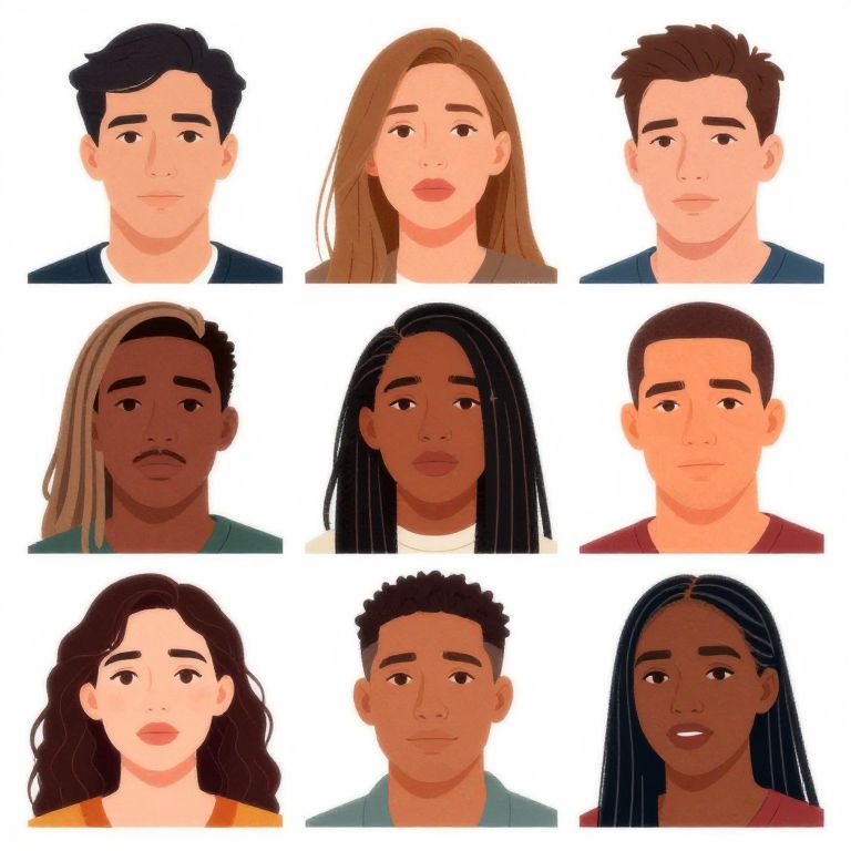 Holography illustrations of 8 faces of video fame developpers of different ethnicities representing different universal emotions,