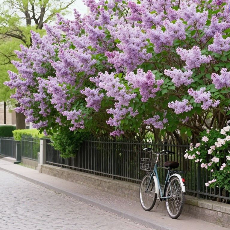 A picturesque spring landscape featuring blooming lilac bushes along a cobblestone street, pastel hues dominating the scene, with a vintage bicycle parked beside a flower-laden fence.