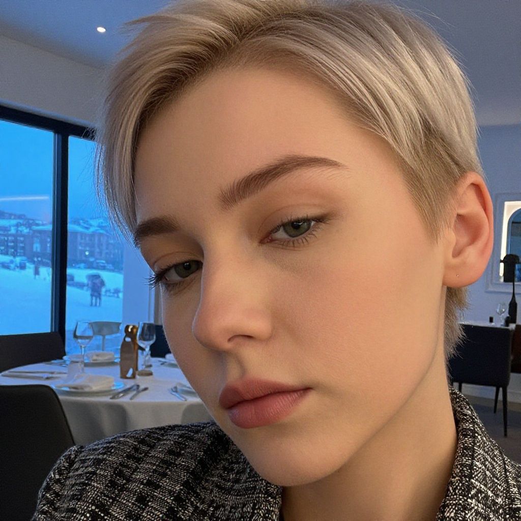 (very close shot, zoomed in close up face portrait:1.5) photo of a **/socaexpressionmouthclosed bored sexy petite 24 year old american woman with short straight side shave blonde hair, . looking towards the camera. modern style, inside a dining room, tundra visible through window, evening. cinematic lighting, vibrant colors, detailed skin texture, detailed cloth texture, beautiful detailed perfect face, intricate sharp details, ultra high res