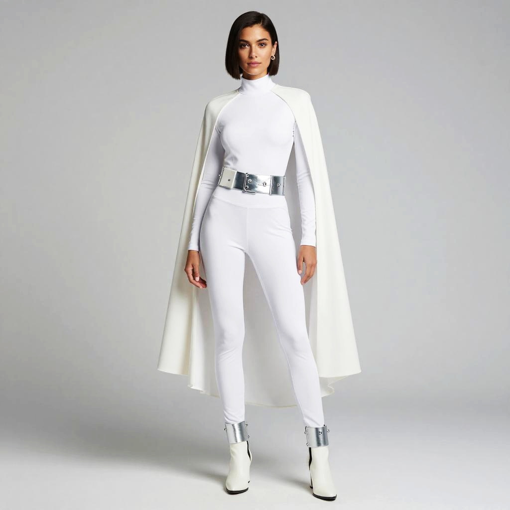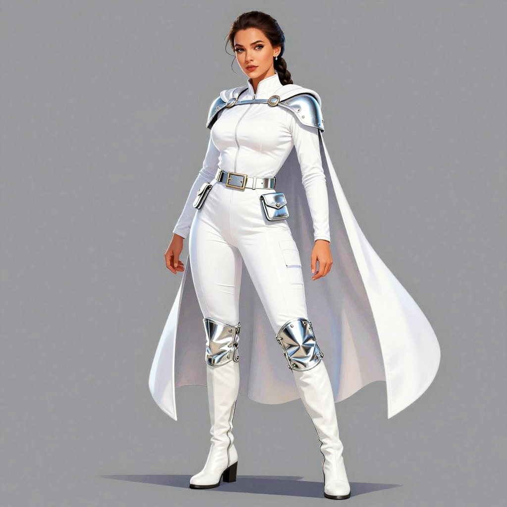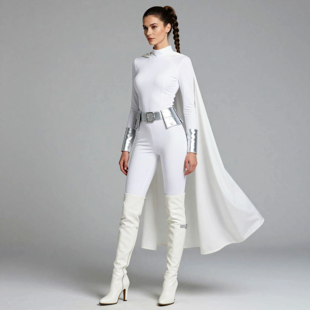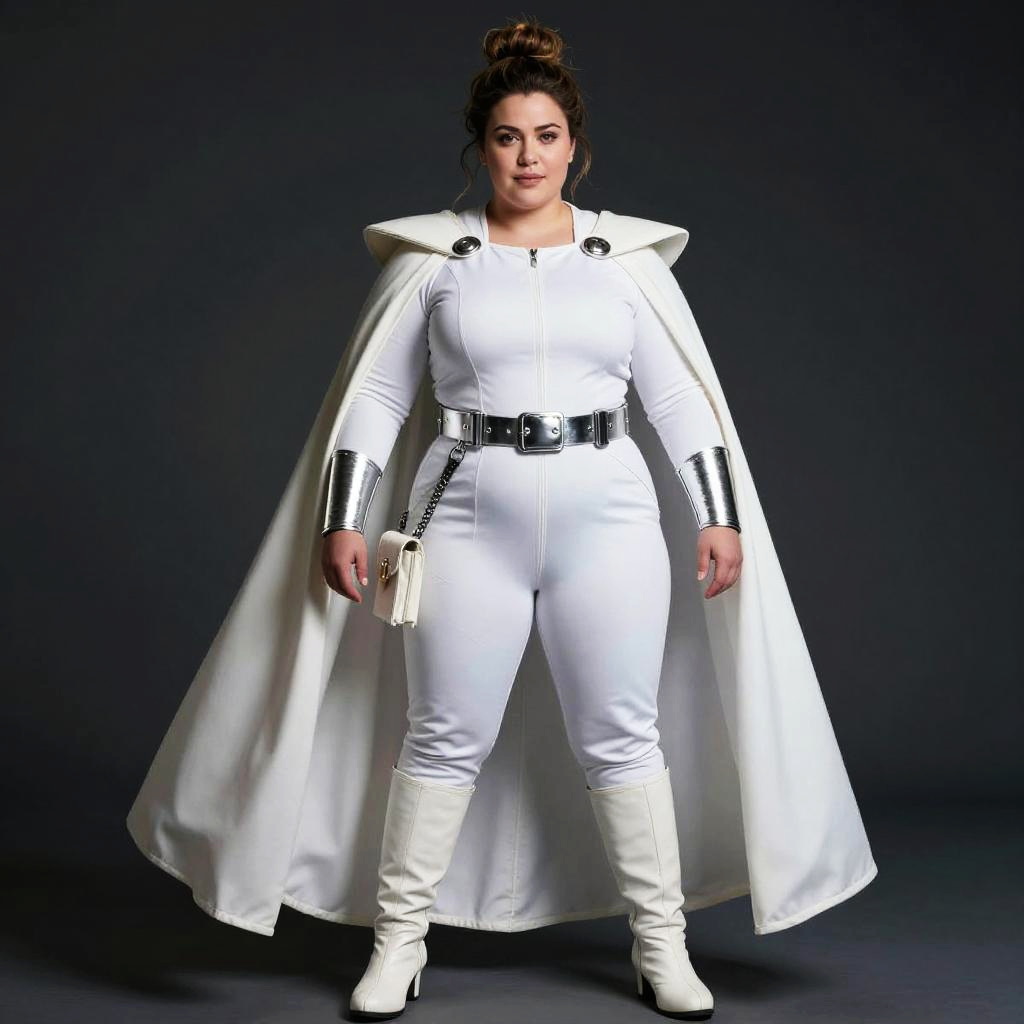 Photo. Apple shaped woman, Messy Bun, padme white outfit, white fitted jumpsuit with a silver utility belt polished finish, white knee-high boots with a silver arm cuff brushed finish, white cape with a silver utility belt polished finish, cinematic portrait, moody lighting, crisp details