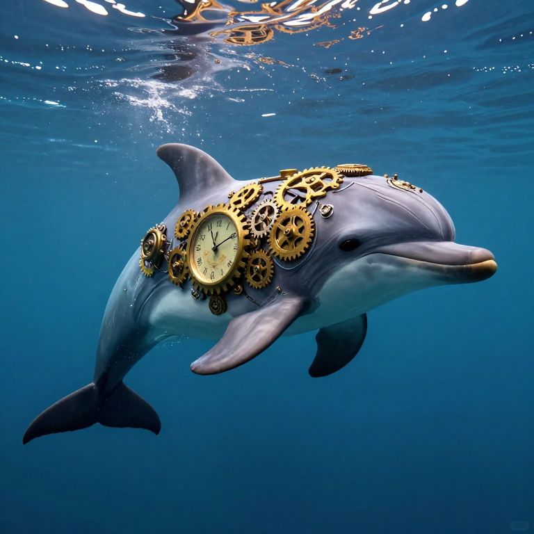 A steampunk-inspired dolphin adorned with intricate mechanical gears and golden clocks swims gracefully beneath the surface, its body seamlessly merging organic form with industrial artistry in a mesmerizing display of surreal aquatic engineering.