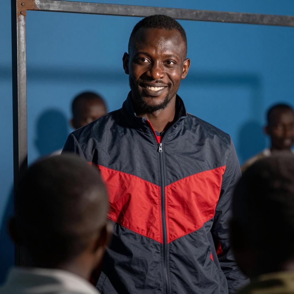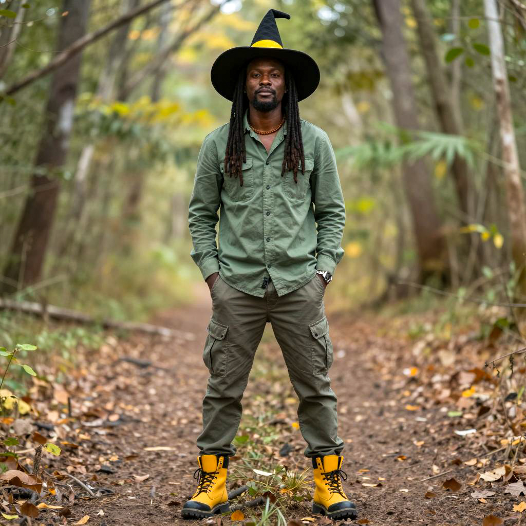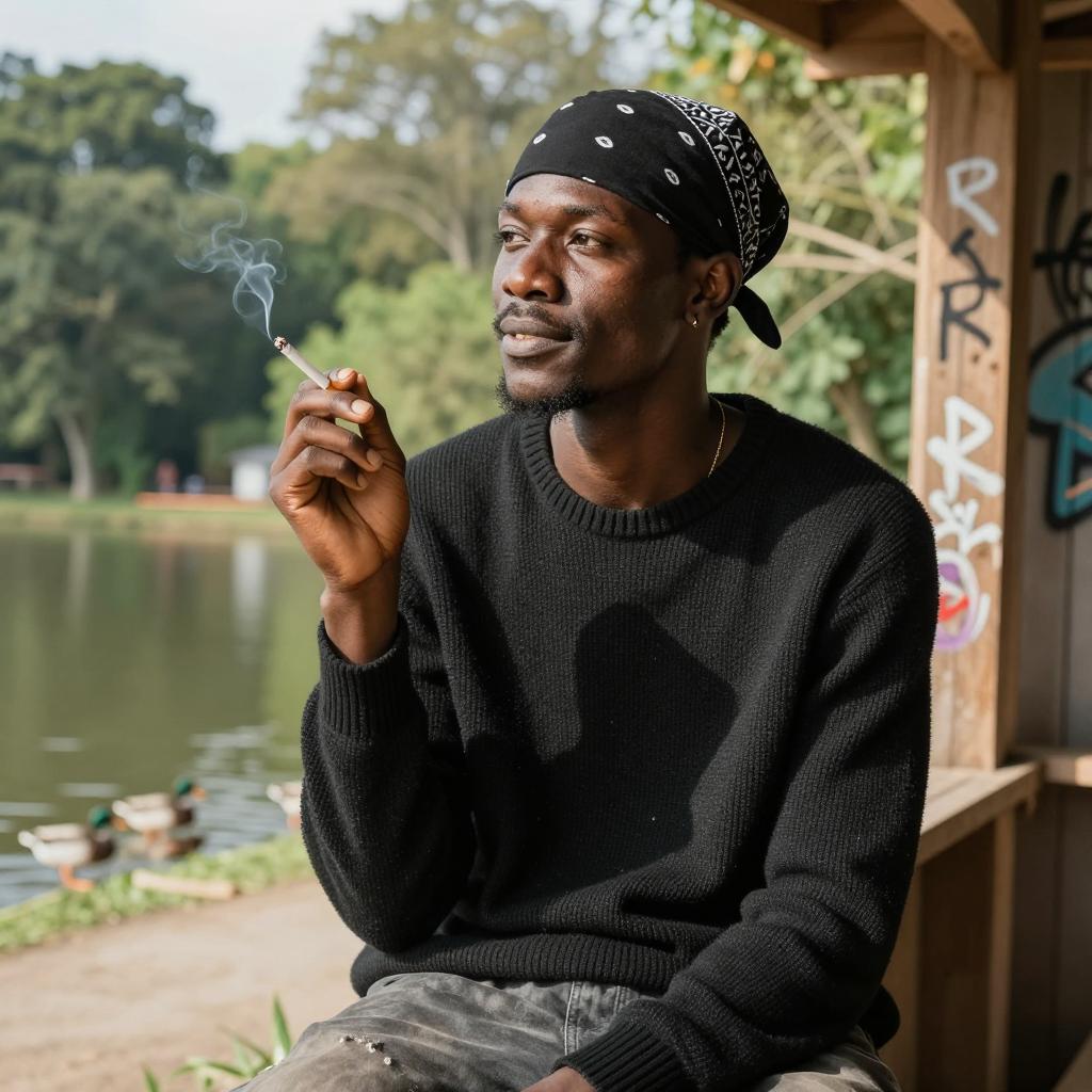 A Black man with dark skin, wearing a beige flat cap, dark sunglasses, and a red-striped long-sleeve shirt, holding a paragliding control bar. He stands in the foreground with hands on hips. Several paragliders with colorful canopies are in the sky. People in casual summer clothes are in the background near a large metal structure. Grass and tents are in the background.