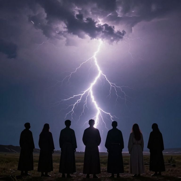 Lightning strikes dramatically split the darkened sky, illuminating a group of robed figures gathered in awe beneath swirling clouds, their silhouettes cast against the radiant, electric display above.