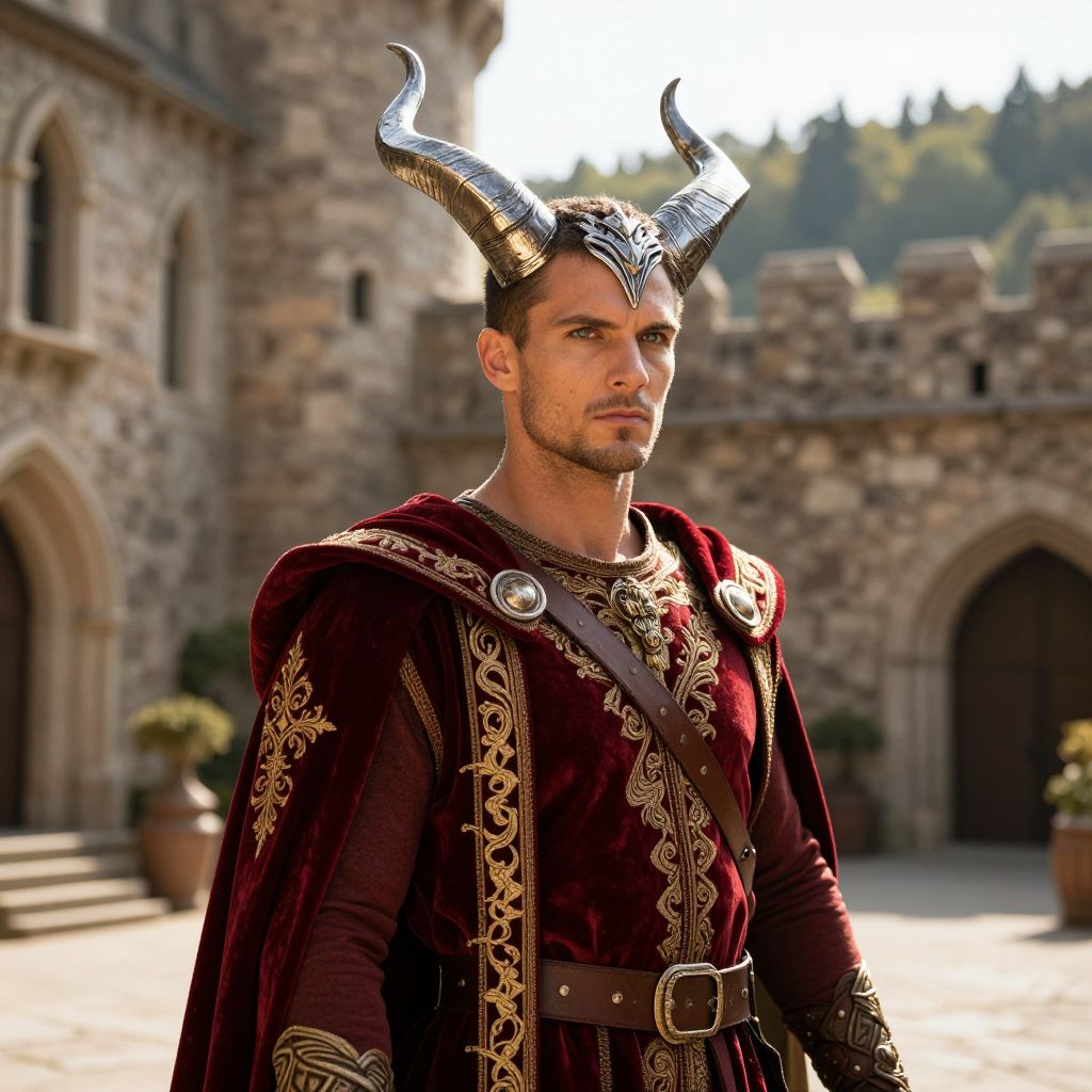A tall, athletic man with a strong, defined facial structure and sharp, intelligent eyes stands confidently in a sun-drenched medieval courtyard. He wears a detailed medieval costume featuring a red and gold embroidered tunic, a velvet cloak with golden embroidery, and a leather harness over his shoulders. On his head are prominent, ornate silver horns that curve elegantly and shimmer in the sunlight, adding a mythical and regal aura. The background shows a rustic stone castle with arching windows and a distant forest, enhancing the fantasy atmosphere. The lighting is warm and golden, casting soft shadows and highlighting the textures of the fabric and the horns.