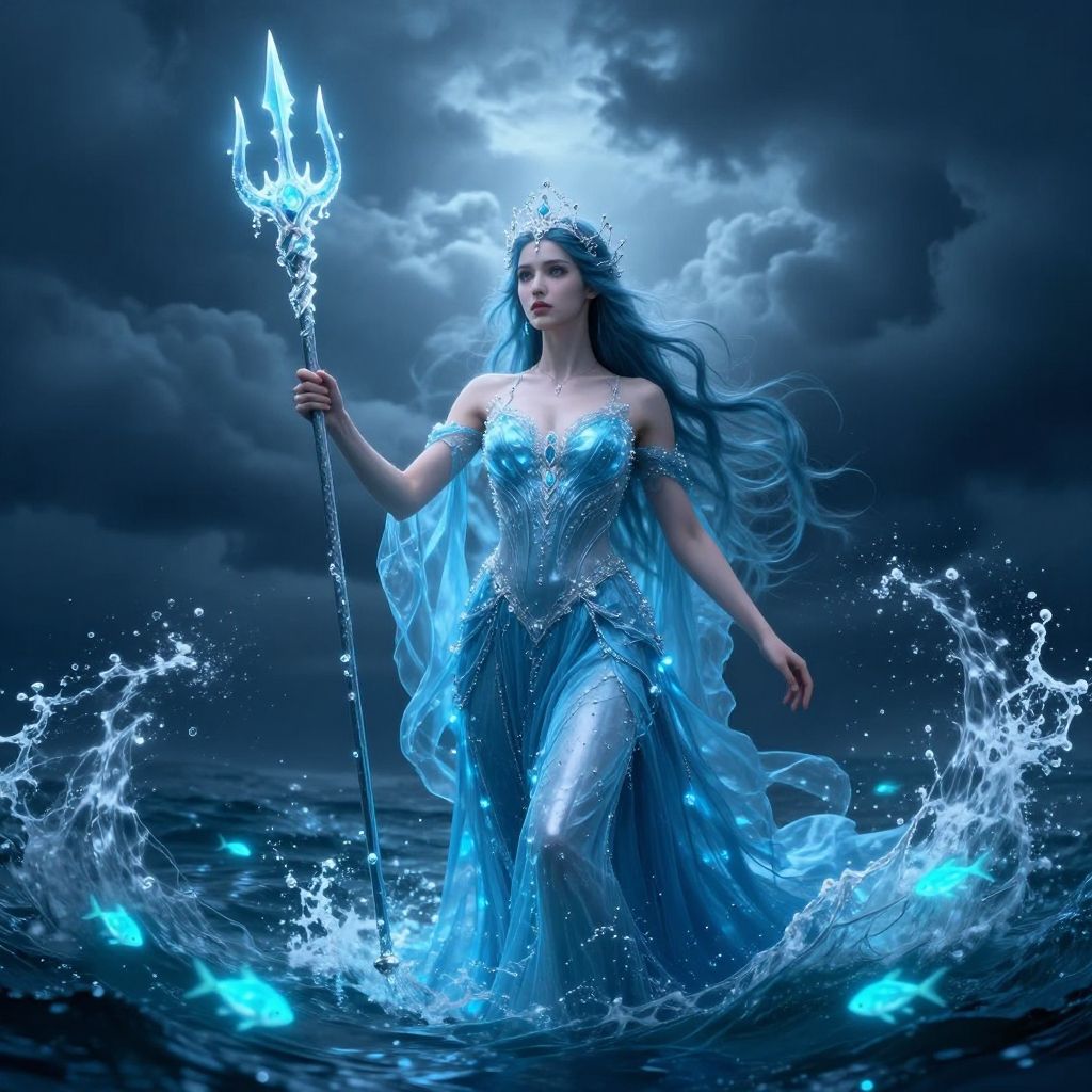 Fantasy water goddess wielding a trident of pure water, commanding the seas with swirling currents, storm clouds gathering, bioluminescent fish lighting the dark waters below, regal and commanding presence
