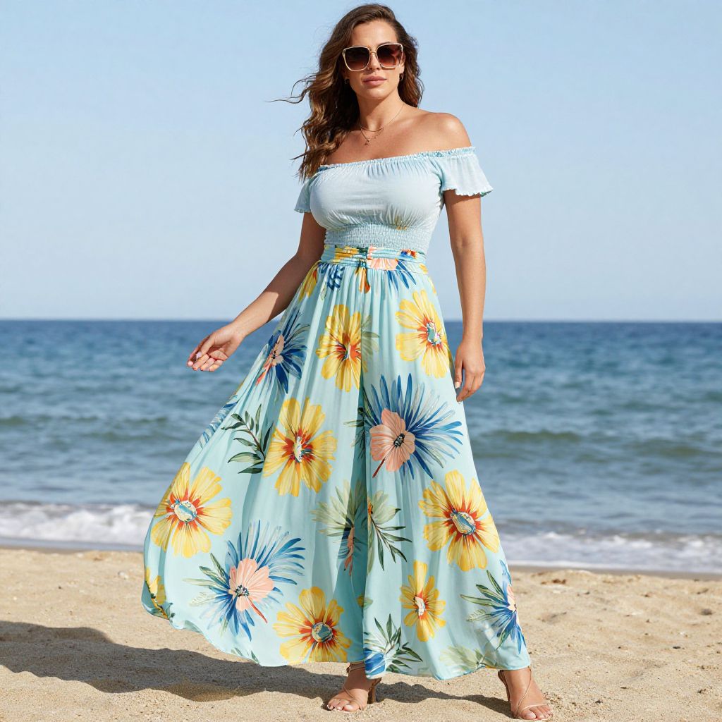 Full body shot, Busty woman, off-the-shoulder top, lightweight cotton fabric, soft pastel color, ruffled edges, fitted bodice, wide palazzo pants, flowy chiffon material, high-waisted design, bold floral print, flowing silhouette, ankle-length, strappy sandals, delicate gold jewelry, oversized sunglasses, beachy waves hairstyle, sun-kissed skin, vibrant summer vibe Sexy. Pretty face and beаutiful eyes. Big breasts