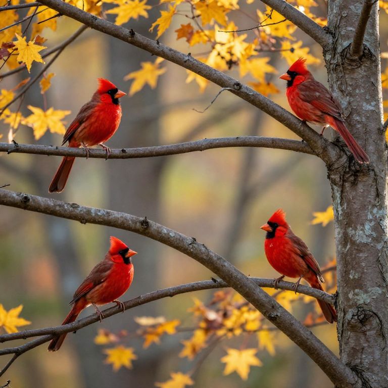Cardinales perched on vivid autumn tree branches, bright red feathers contrasting with golden leaves, soft sunlight filtering through dense forest, hyper-realistic nature scene, intricate detailing of feathers and bark, tranquil morning atmosphere
