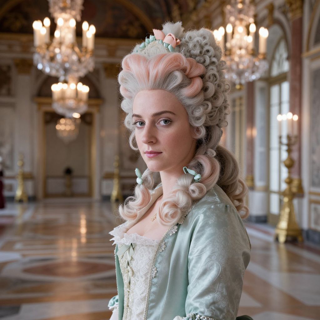 Digital art of a young woman with elaborate 18th-century pastel pink and white powdered wig, wearing a light blue satin dress, standing in an