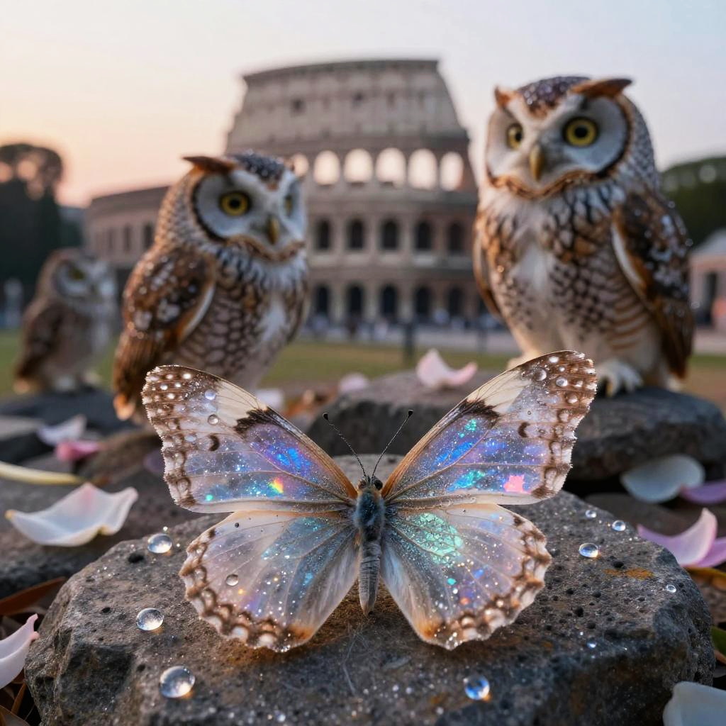 Celestial celestial stone amphitheater at dawn, endearing minute star-chased owl familiars prancing among petals, a butterfly in the foreground formed from twinkling astral quartz threads, dewdrops glitter, intricate textures, iridescent colors, macro realism, magical realism, hyperrealistic, volumetric light, soft bokeh, tactile details, storybook yet believable, 8k clarity