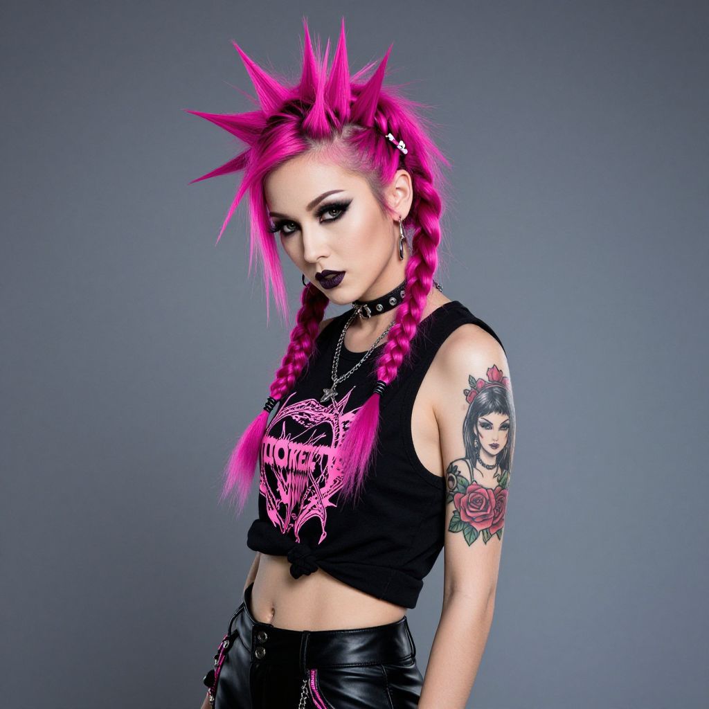 Photograph of a punk-rock woman with bright pink spiky hair, black lipstick, braided pigtails, black crop top, leather pants,