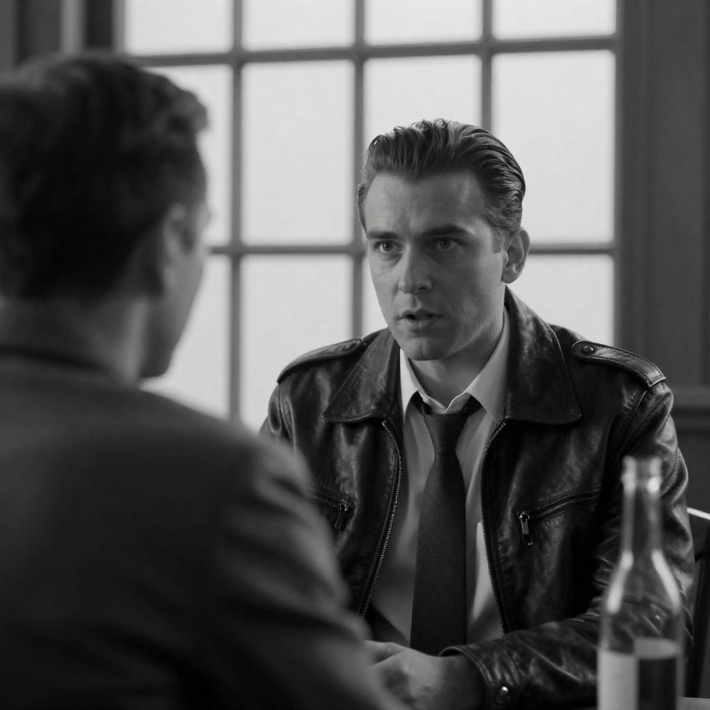 Black-and-white photograph of a man in a leather jacket and tie, facing another person with their back to the camera. Man has slicked-back hair, intense gaze, and slightly open mouth. Background: window with grid pattern. Right side: glass bottle.