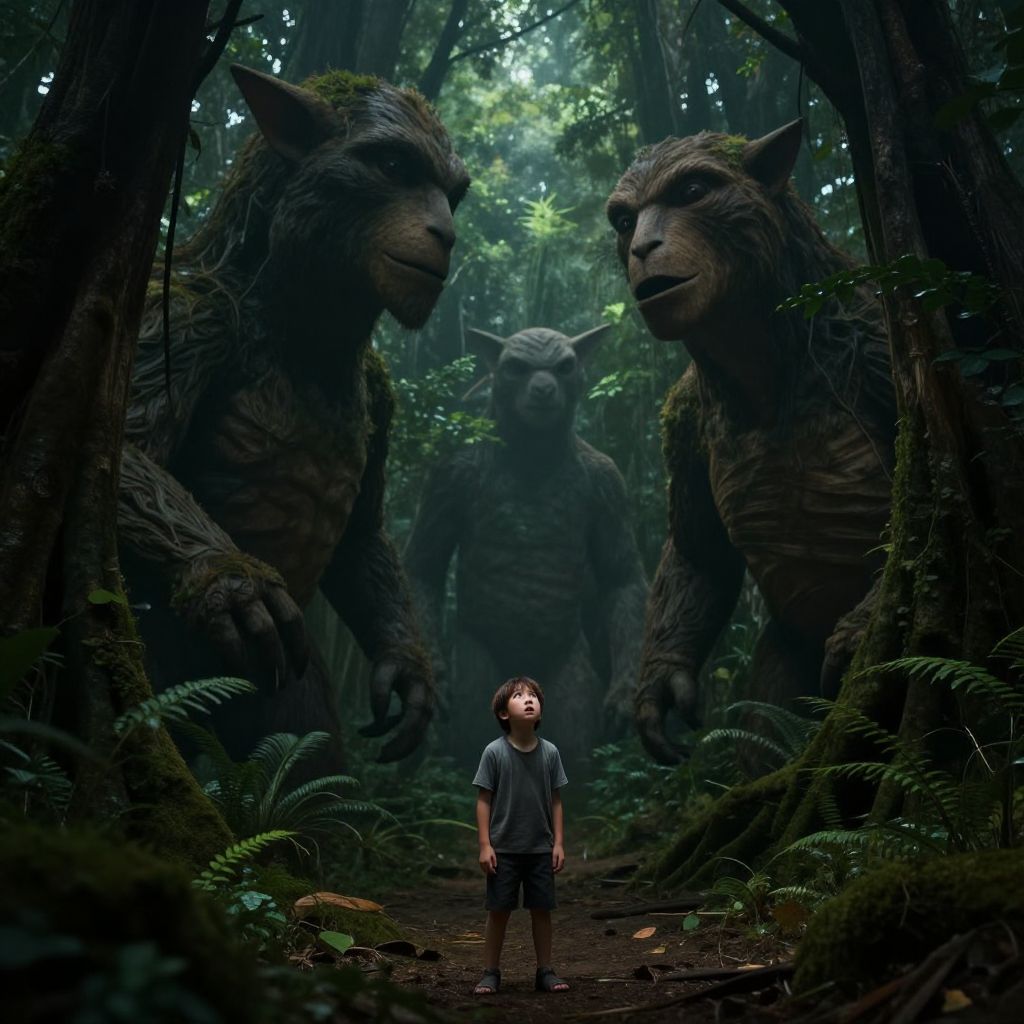 Photorealistic CGI: A large, fierce rabbit with gray fur and glowing eyes stands over a small, frightened boy kneeling in front of a small fire