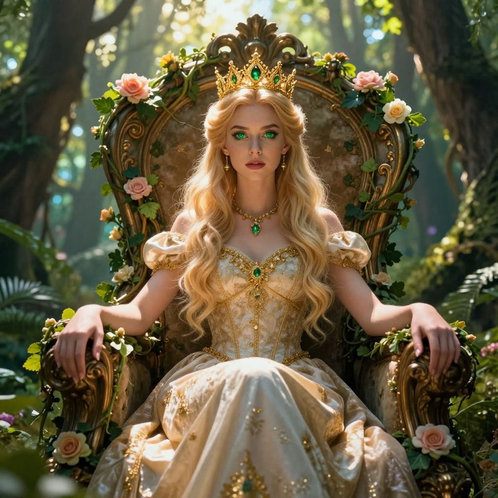 Fantasy beautiful princess with emerald green eyes and golden crown, sitting on an ornate throne of vines and flowers, radiant sunlight filtering through enchanted forest canopy, highly detailed fantasy style