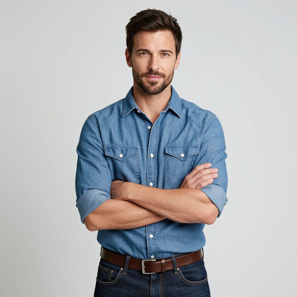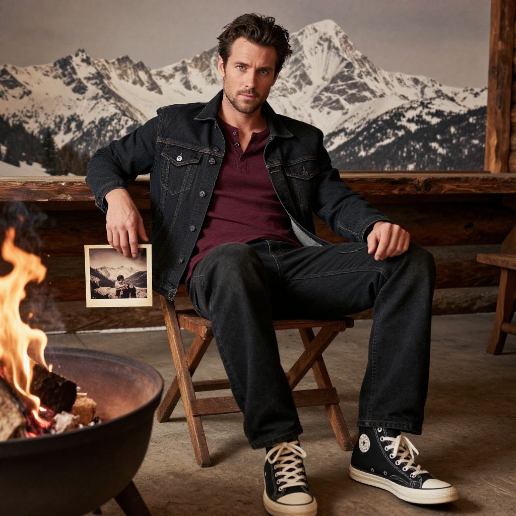 A man, dark denim jacket, straight-leg black jeans, burgundy henley shirt, black high-top sneakers, rugged look, mountain lodge, snow-capped peaks, cozy fire pit, vintage photo, relaxed expression Man has masculine face and piercing eyes