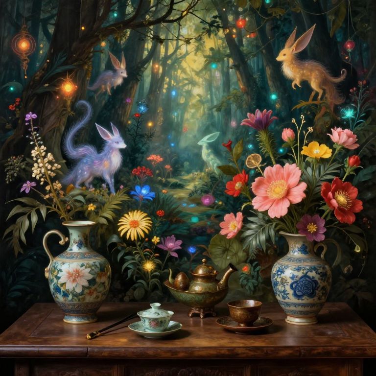 Whimsical still life painting: colorful flowers in ornate vases, teapot, tea set, fairy-like creatures, glowing lights, forest backdrop