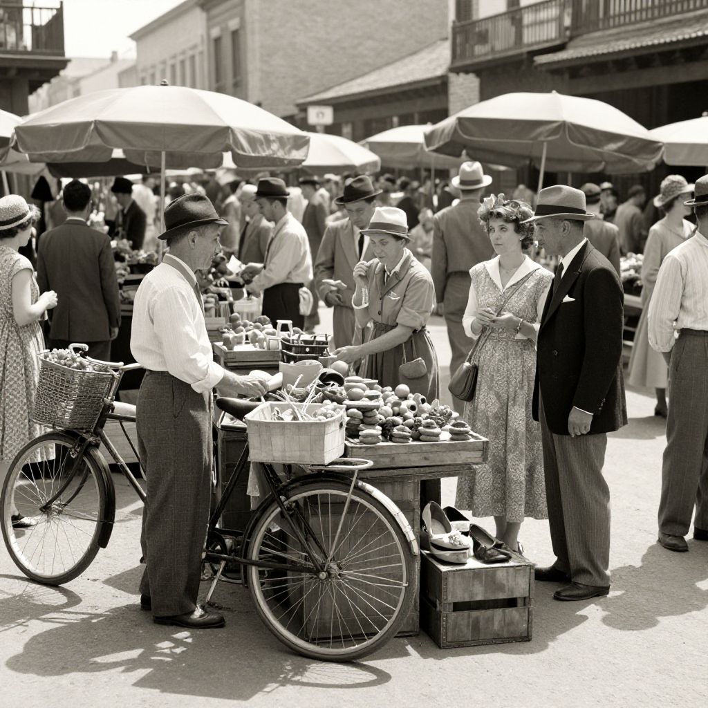 1938 bustling street market scene, vendors selling fresh produce and handcrafted goods, men in fedoras and women in elegant dresses, old-fashioned bicycles leaning against wooden crates, sunlight casting long shadows on the lively crowd.