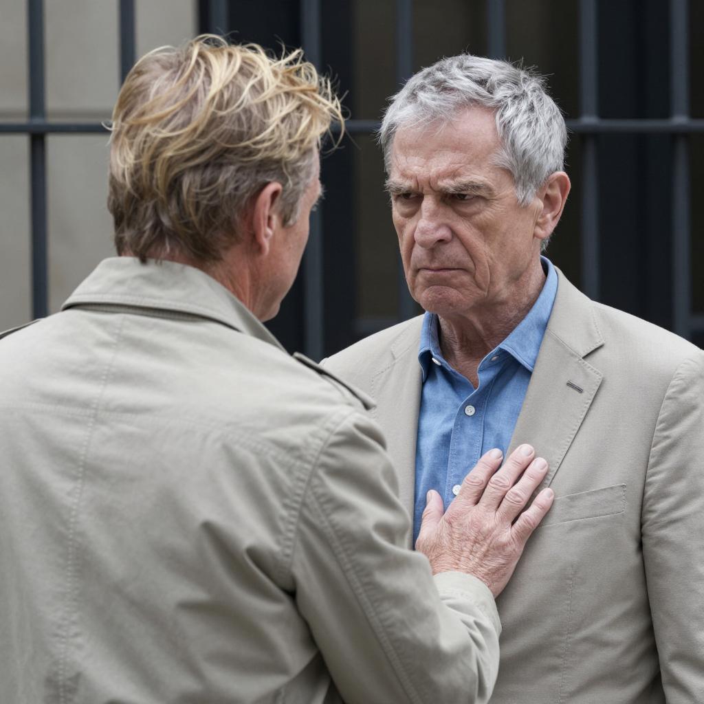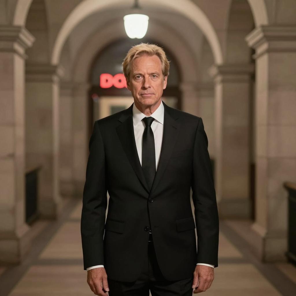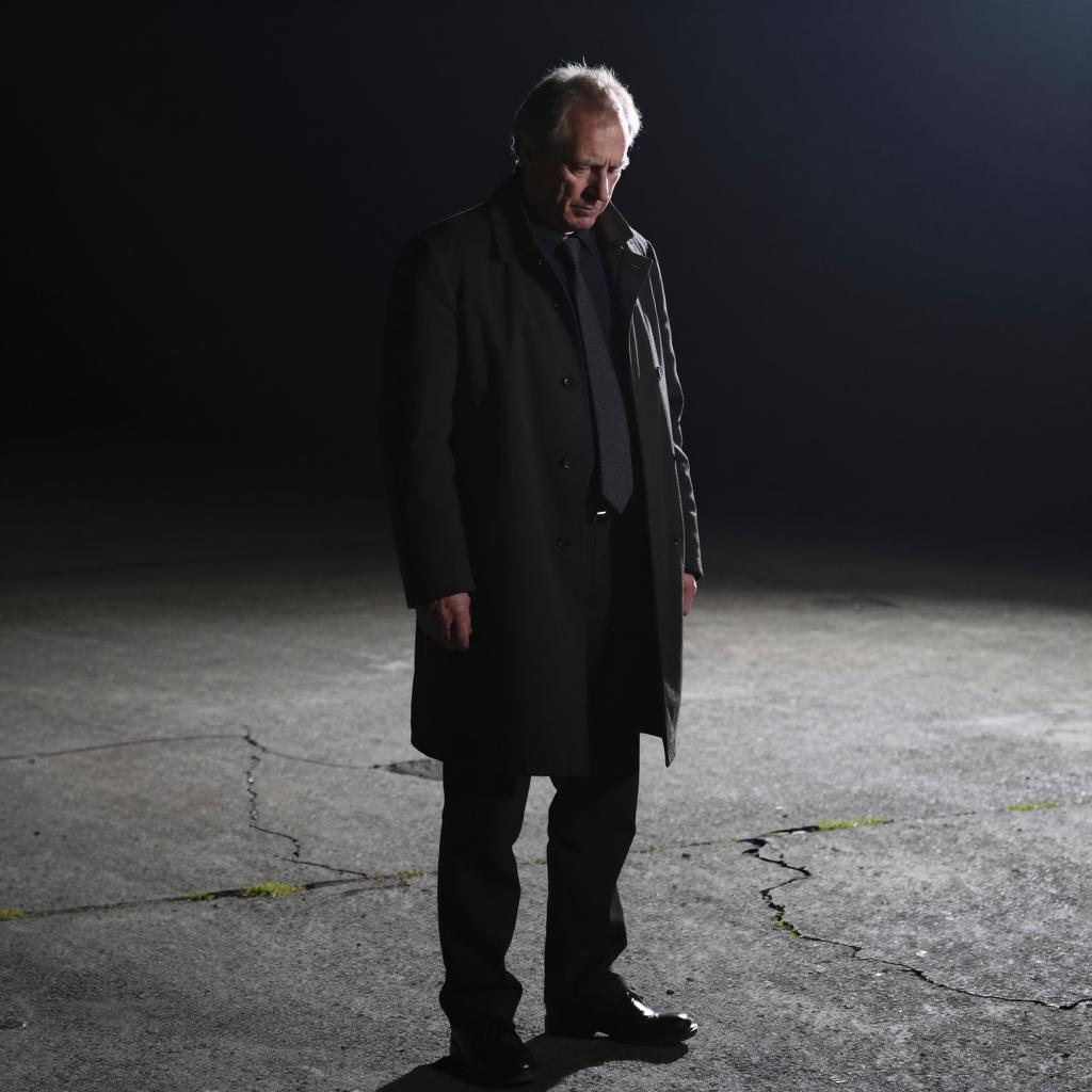 A middle-aged man with short, light-colored hair, standing on a dimly lit, cracked pavement at night. He wears a long, dark overcoat, a dark shirt, and a tie. His head is slightly bowed, and he looks downward. A strong beam of light shines from above, illuminating the right side of his face and the pavement. The left side is in deep shadow.