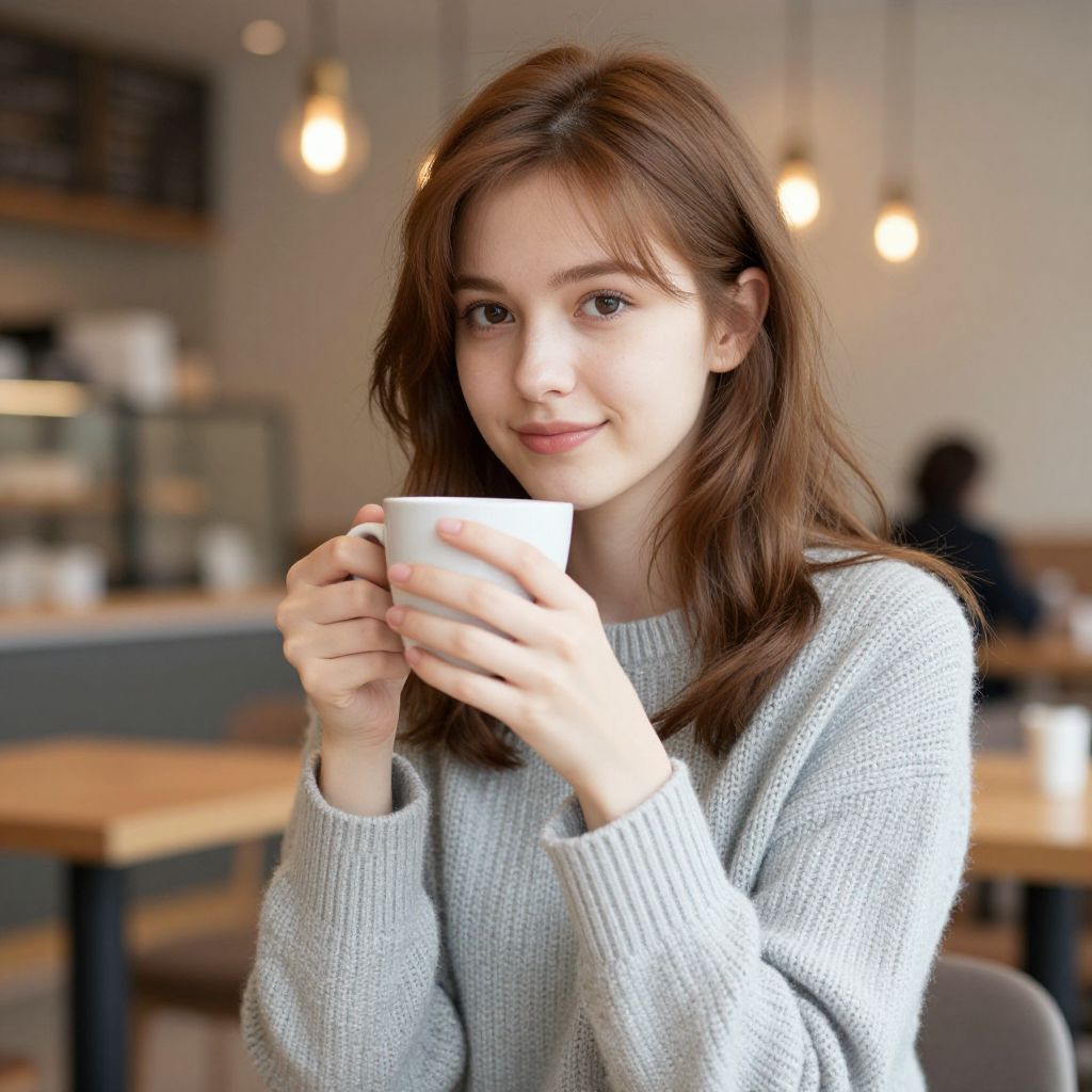 A photograph of a young woman with light brown hair and fair skin, wearing a gray knit sweater, holding a white cup in both hands and smiling softly. She's sitting in a cozy café with wooden tables and blurred, warm light fixtures in the background. The image has a soft focus, giving it a dreamy, relaxed vibe.