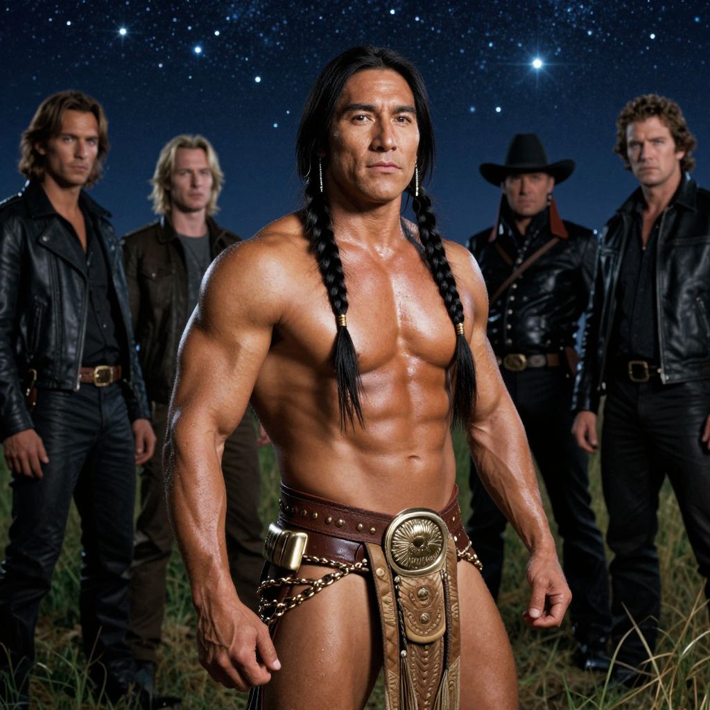 Photograph of a muscular, tan-skinned man with long black hair in two braids, standing shirtless under a starry night sky. He wears a brown leather belt with a large circular buckle and a decorative chain. Behind him, four men with varying hair colors and styles wear black leather jackets and jeans, creating a rugged, western outlaw look. The grassy field and dark blue sky enhance the dramatic, heroic atmosphere. The man in the foreground has a confident, determined expression, while the background figures appear to be in a protective stance. The image has a polished, cinematic quality.