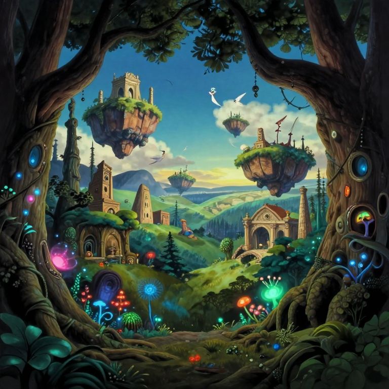 Imagine an enchanting surrealist landscape where a towering tower looms over a tranquil garden from an unconventional perspective, as if seen through the lens of a curious ant. Intricate machinery and vibrant flora intermingle in a mesmerizing dance, blurring the line between nature and technology. The sunlight casts elongated, fantastical shadows that reach towards a distant horizon adorned with floating islands, evoking a sense of awe and wonder akin to stepping into an alternate reality. This meticulously crafted tableau captures the whimsy and intrigue typical of Dali-inspired works while offering a novel viewpoint for observers to navigate between the realms of reality and illusion.