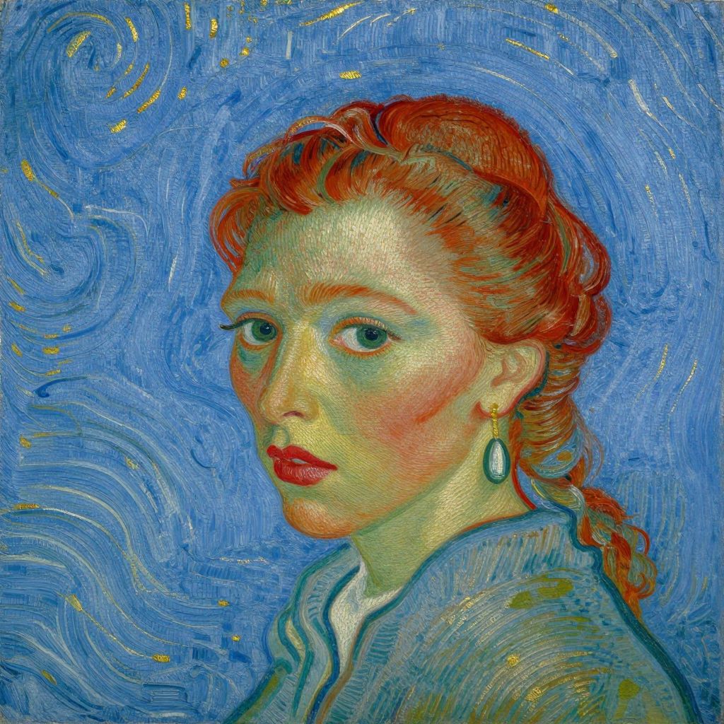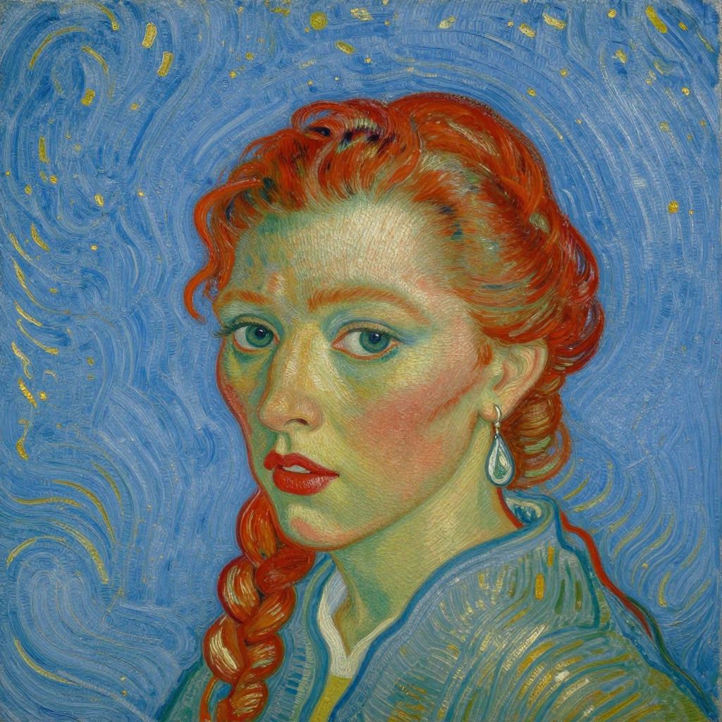 Portrait featuring a woman with vibrant red hair styled in a braided updo, adorned with a dangling earring, set against a swirling blue background with golden speckles, reminiscent of Van Gogh's style in \"Head of a Woman,\" painted in 1885.