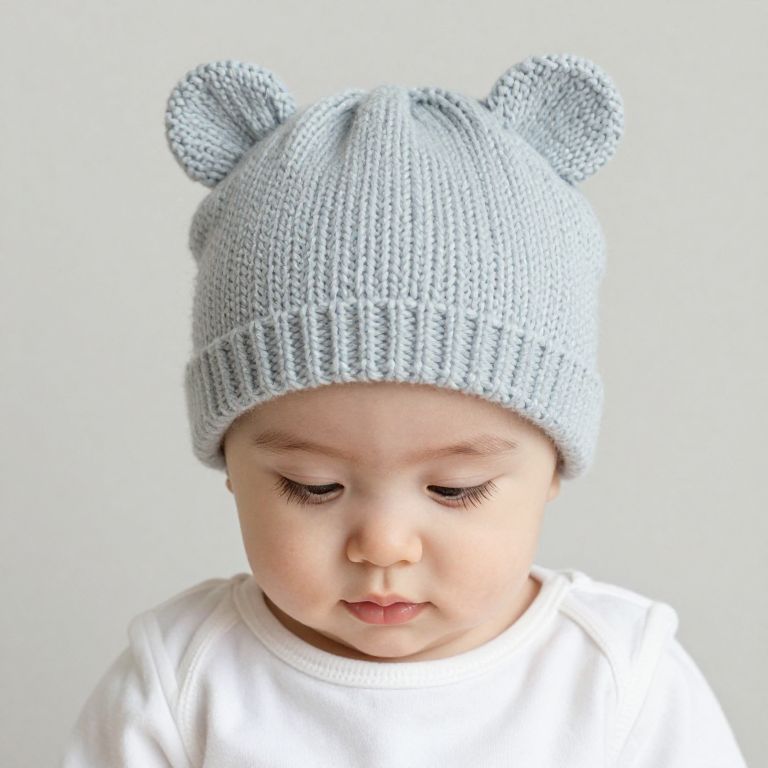 Photograph of a baby with fair skin, wearing a light gray knitted bear hat with round ears, and a white shirt, looking down with closed