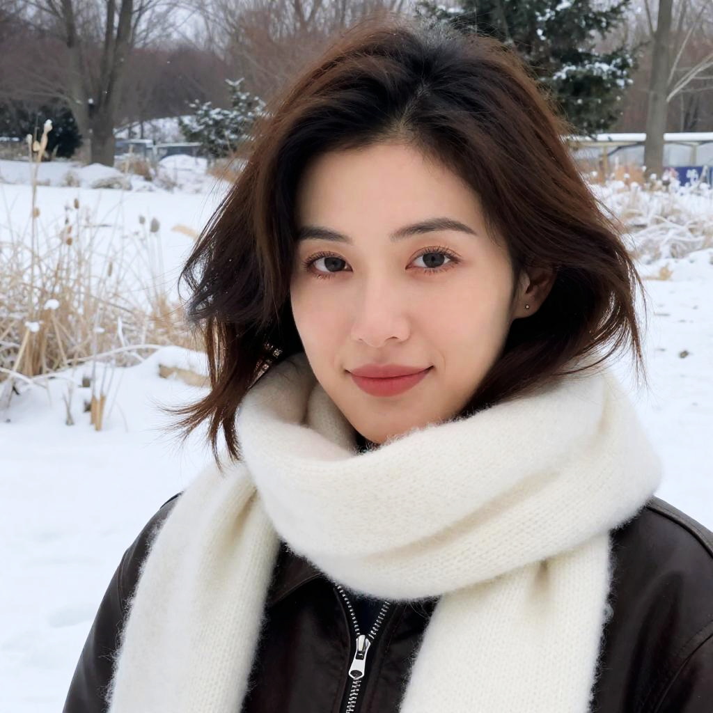A woman stands on a snow-covered urban pathway lined with leafless trees. She is dressed in a black winter coat with a fur-trimmed hood, black gloves, and black lace-up boots. A bright red scarf adds a vivid contrast to her winter outfit. The scene captures the quiet and cold atmosphere of a winter day.