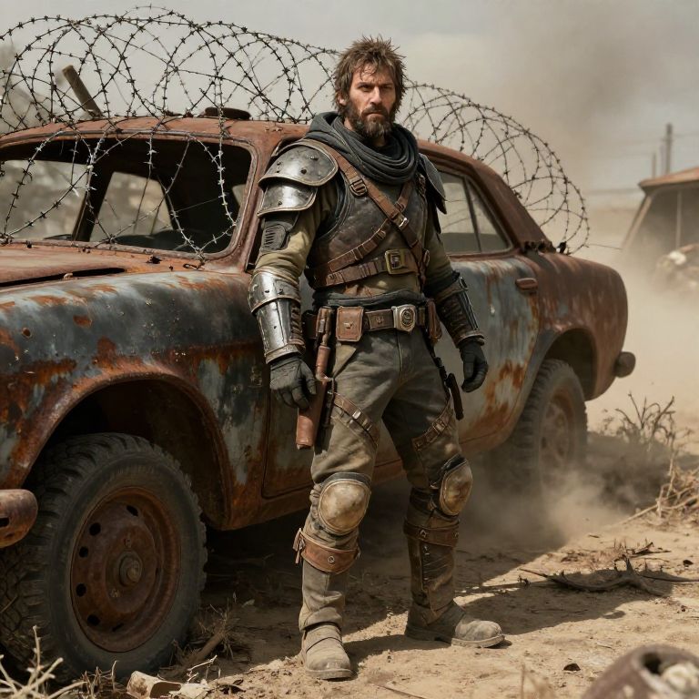 Rez in a dystopian wasteland setting, rugged survivalist wearing makeshift armor, standing beside a rusted vehicle wrapped in barbed wire, dusty and bleak environment, dramatic lighting with intense shadows and high detail post-apocalyptic style