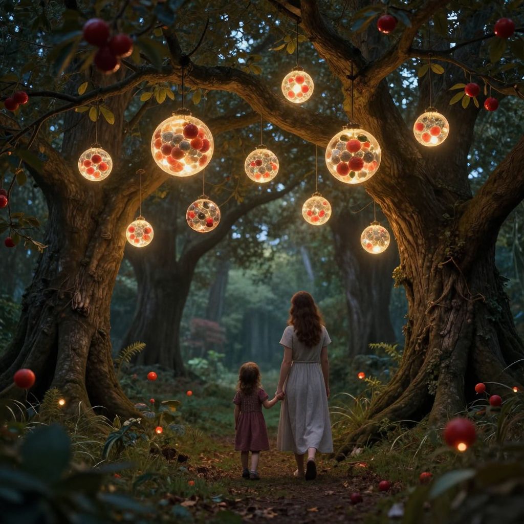 Luminous spheres hang from a mystical tree as a woman and child walk hand-in-hand through a forest filled with glowing red fruits, symbolizing the passage of time in a serene, enchanted world.