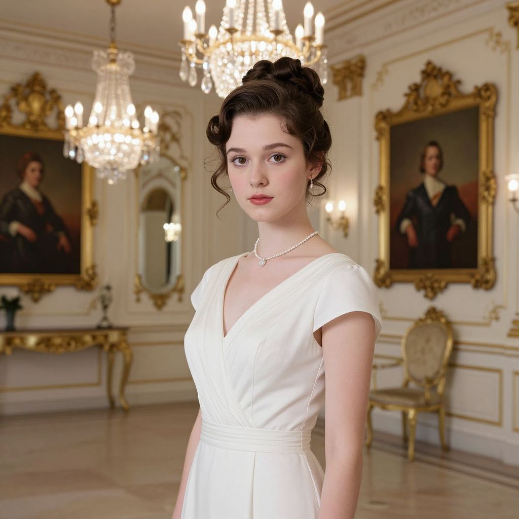 Photorealistic digital image of a young woman with fair skin and dark, wavy hair styled in an updo. She wears a white, sleeveless, V-neck dress with a fitted bodice and a delicate pearl necklace. She stands in an opulent, grand room with ornate gold-trimmed white walls, two large, framed portraits, a crystal chandelier, and an elegant chair. The room has a luxurious, classical style with a polished marble floor. The woman's expression is calm and poised, facing slightly to the left.