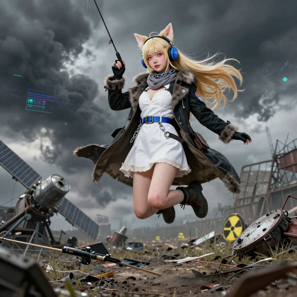 Breathtaking (best quality, masterpiece, detailed, 8k)RAW, realistic cinematic documentary photo, (FuwawaAbyssgard, long blonde hair, pink eyes, hairband, hairclip, chained belt collar, blue headphones:1.2), (pointed dog ears:1.3), hair covering ears, With a Fishing Kit, black jacket, fur-trim, blue belt, white dress, cleavage cutout, Post-apocalyptic, shabby Negotiator's Outfit: Trench coat, scarf, sturdy boots, satchel, gloves., Holding a Taser, jumping dynamic pose, looking at viewer, wide angle, Expressive, Pin Spot Lighting, Post Apocalyptic Wasteland, Toxic clouds and radiation hazards, fallen satellite, twisted metal, electronic glitches, lost connections, (masterpiece, award-winning, professional, HDR), detailed skin texture, (blush:0.5), (goosebumps:0.5), subsurface scattering, dry skin, fuzzy skin