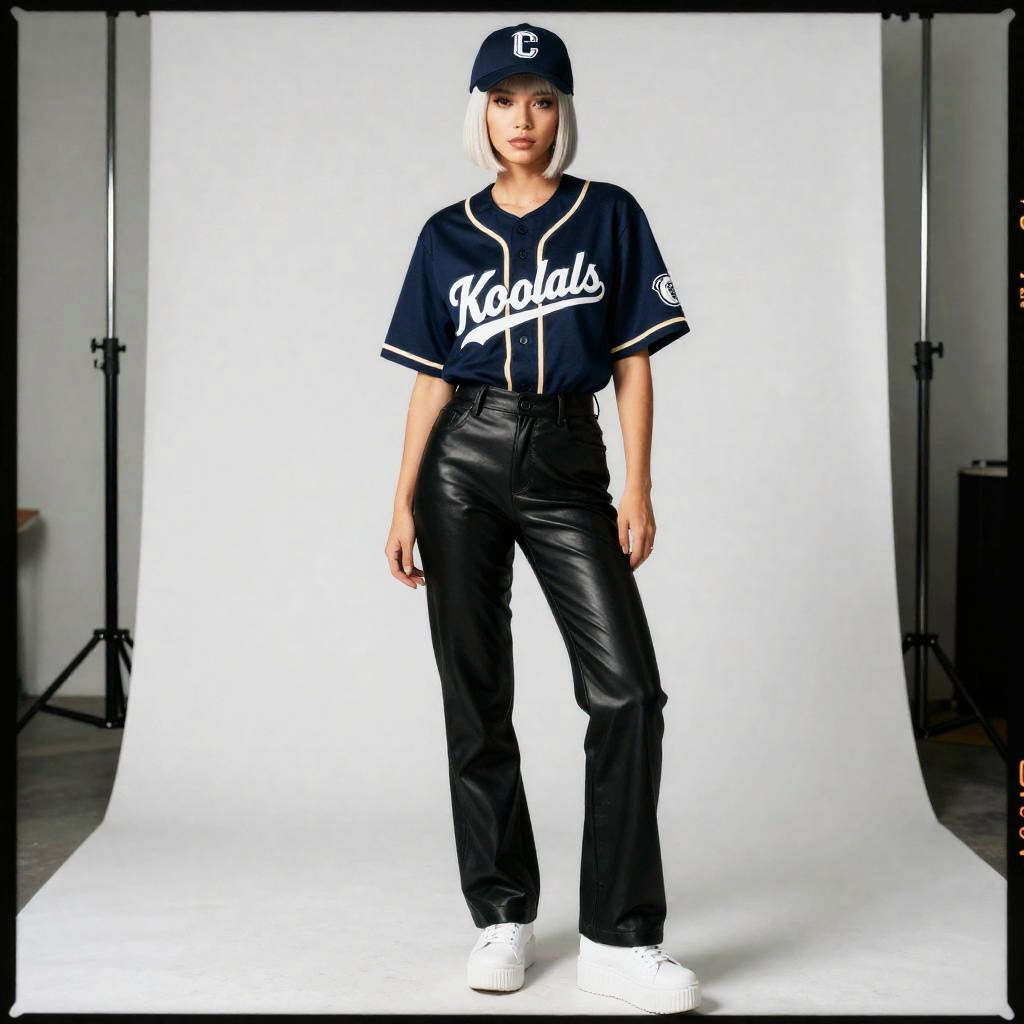 Young adult woman, Athletic, Platinum bob with blunt bangs, baseball jersey outfit, navy oversized baseball jersey with high-waisted leather trousers, white platform sneakers and matching navy baseball cap, kodak portra analog film stock