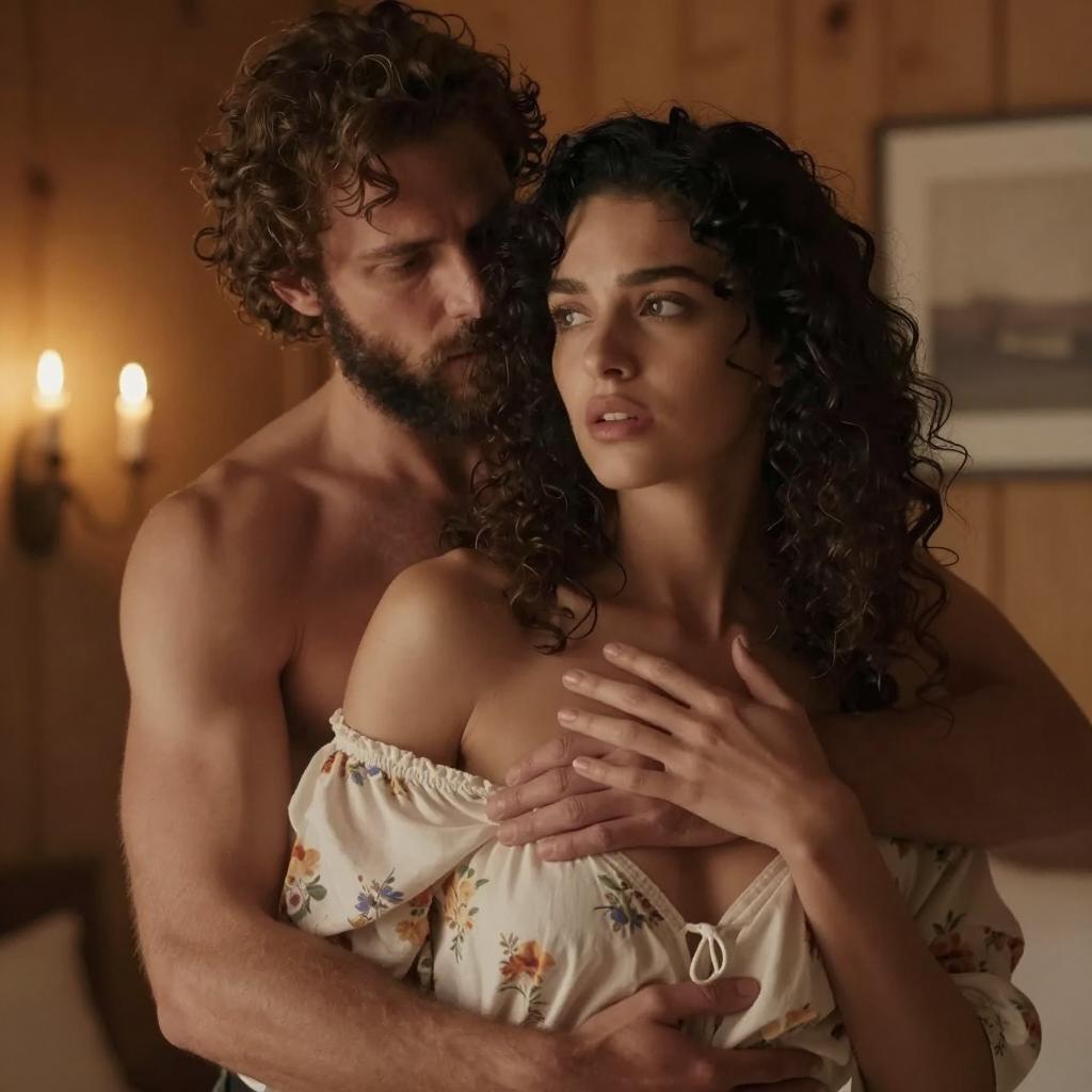 Group of six people sitting around a fire in a rustic setting. Central man with short curly hair, gray vest, sleeveless shirt, gesturing with hands. Woman with long black hair, brown top, on left. Man with long beard, white shirt, black vest, on right. Others with curly hair, diverse clothing. Large black pot in foreground. Background includes more people, torches, wooden structures. Evening light.