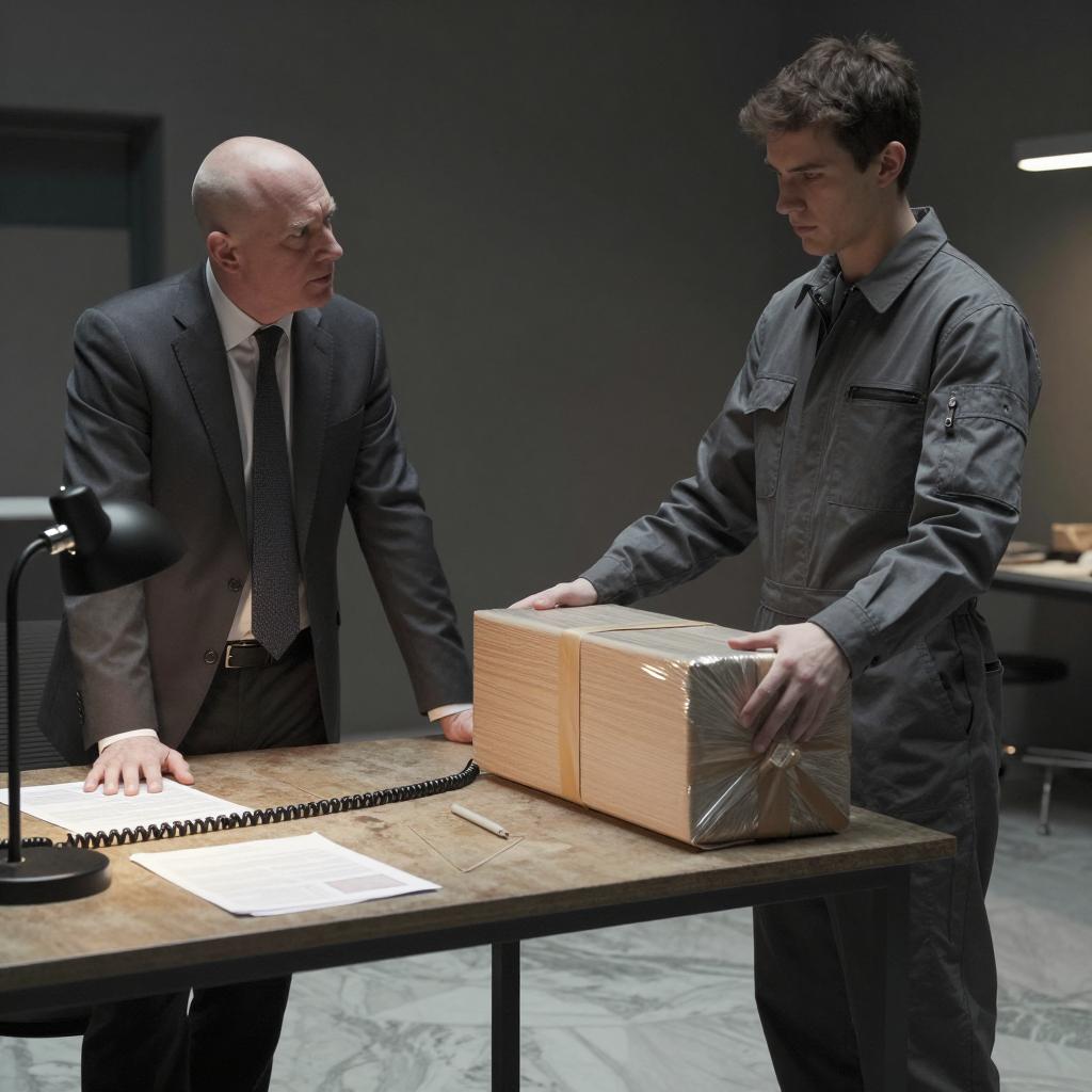 Two men in a dimly lit room. Bald man in suit on left, hands on table, looking at documents. Young man in grey jumpsuit on right, holding a large, wrapped object. Table with coiled phone cord, black lamp, papers. Marble floor, industrial setting. Bald man's expression serious, young man's expression focused.