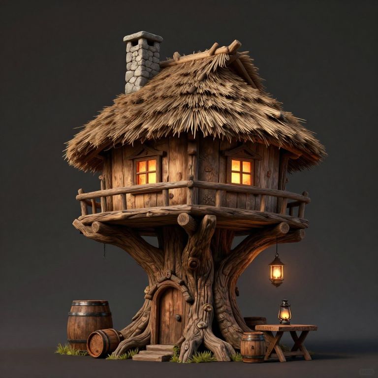 The image depicts a whimsical, medieval-style baba yaga hut, perched precariously on a large, gnarled tree trunk. The hut is constructed from weathered wood, with a thatched roof and a stone chimney, exuding an air of rustic charm and mystery. The windows are adorned with warm, inviting lights, suggesting a cozy interior. Surrounding the base of the tree are various objects, including barrels, a lantern, and a small table, adding to the enchanting atmosphere. The overall composition is balanced, with the tree trunk serving as a central support, and the hut and its surroundings arranged in a harmonious, three-dimensional space. The interplay of light and shadow enhances the depth and texture of the scene, creating a sense of depth and realism.