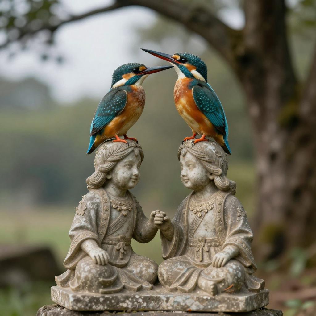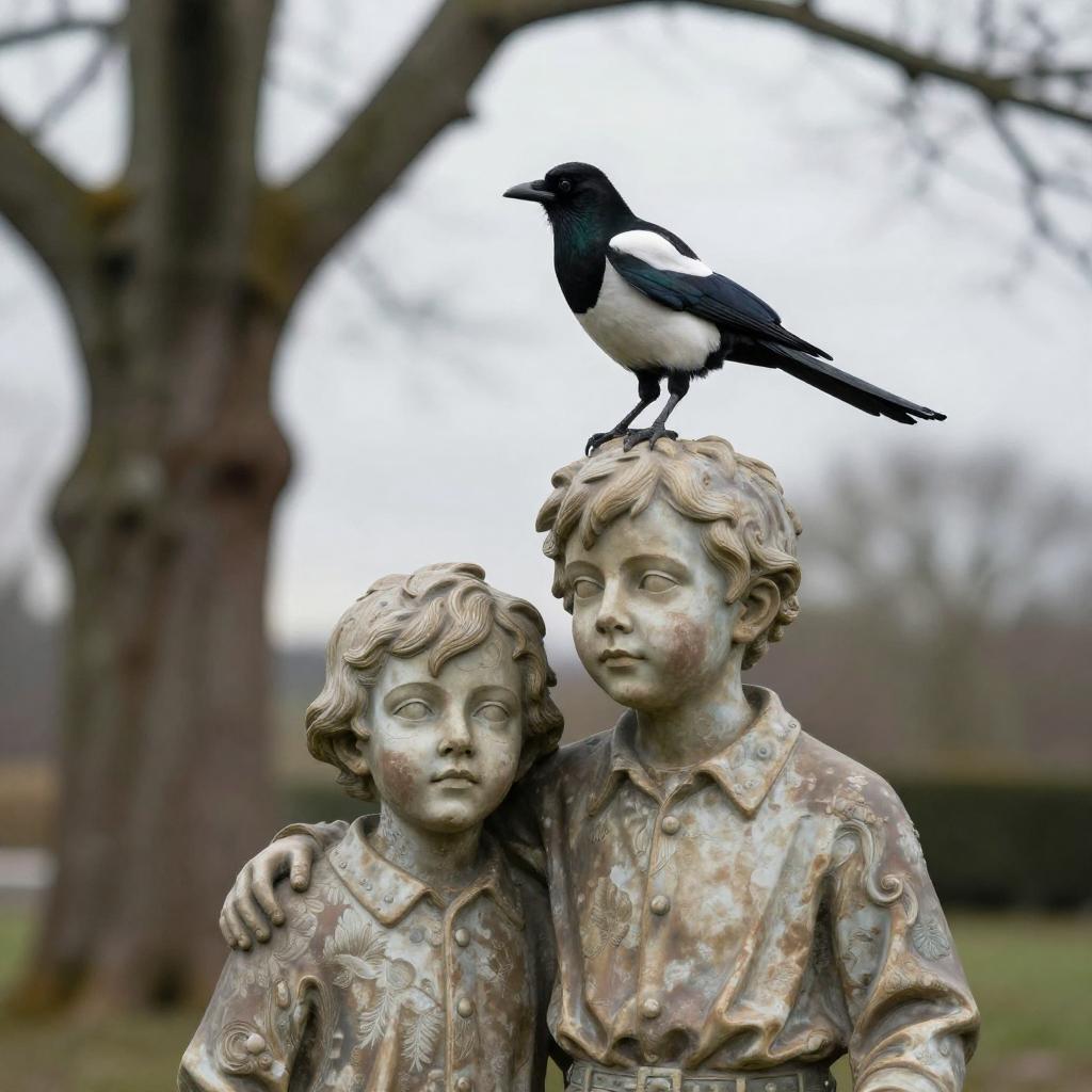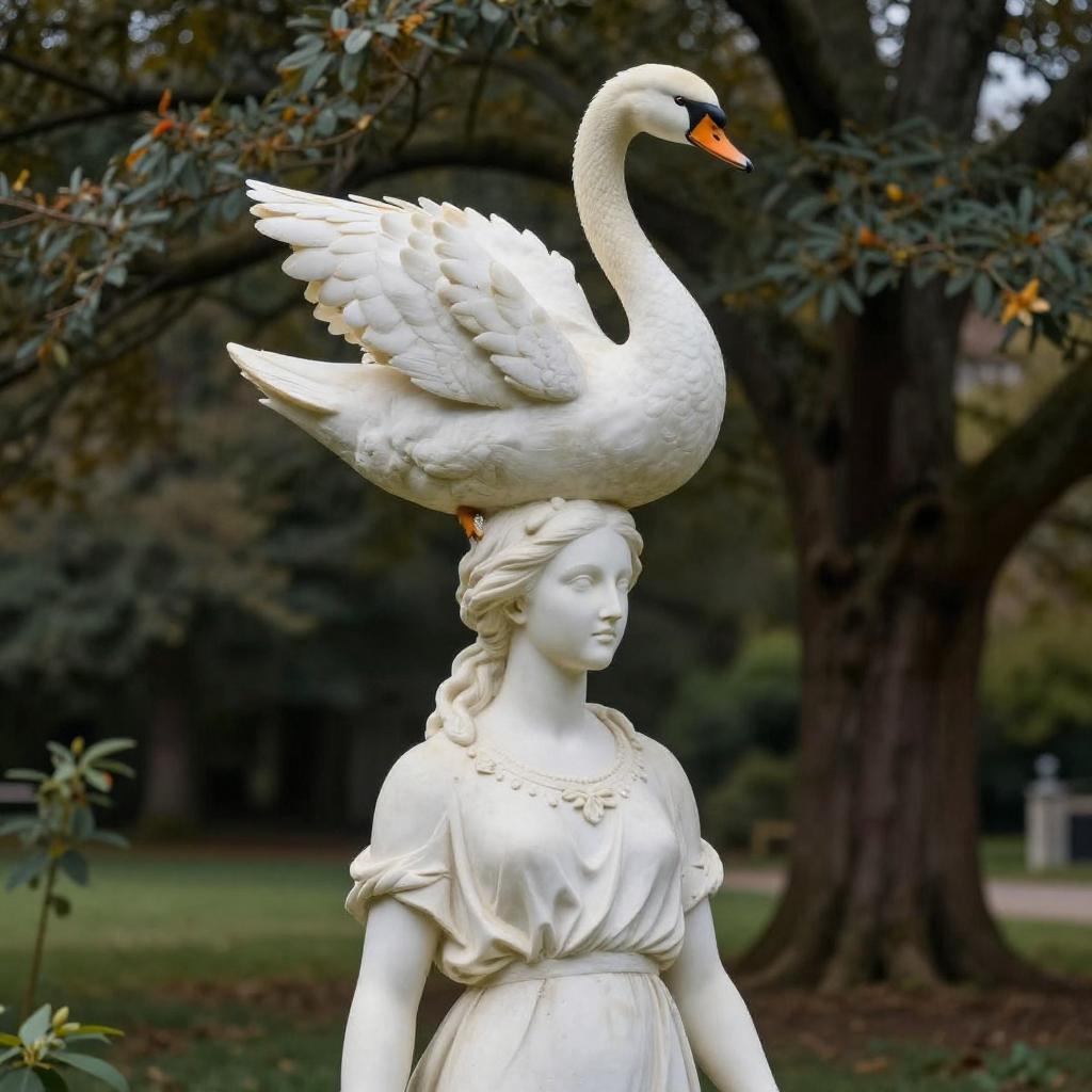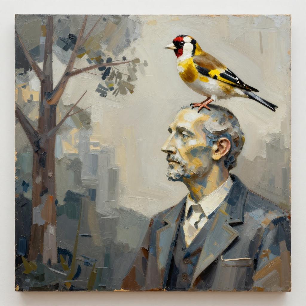 Statue of a scientist and artist with a goldfinch on their head, and a tree in the background, inspired by abstract